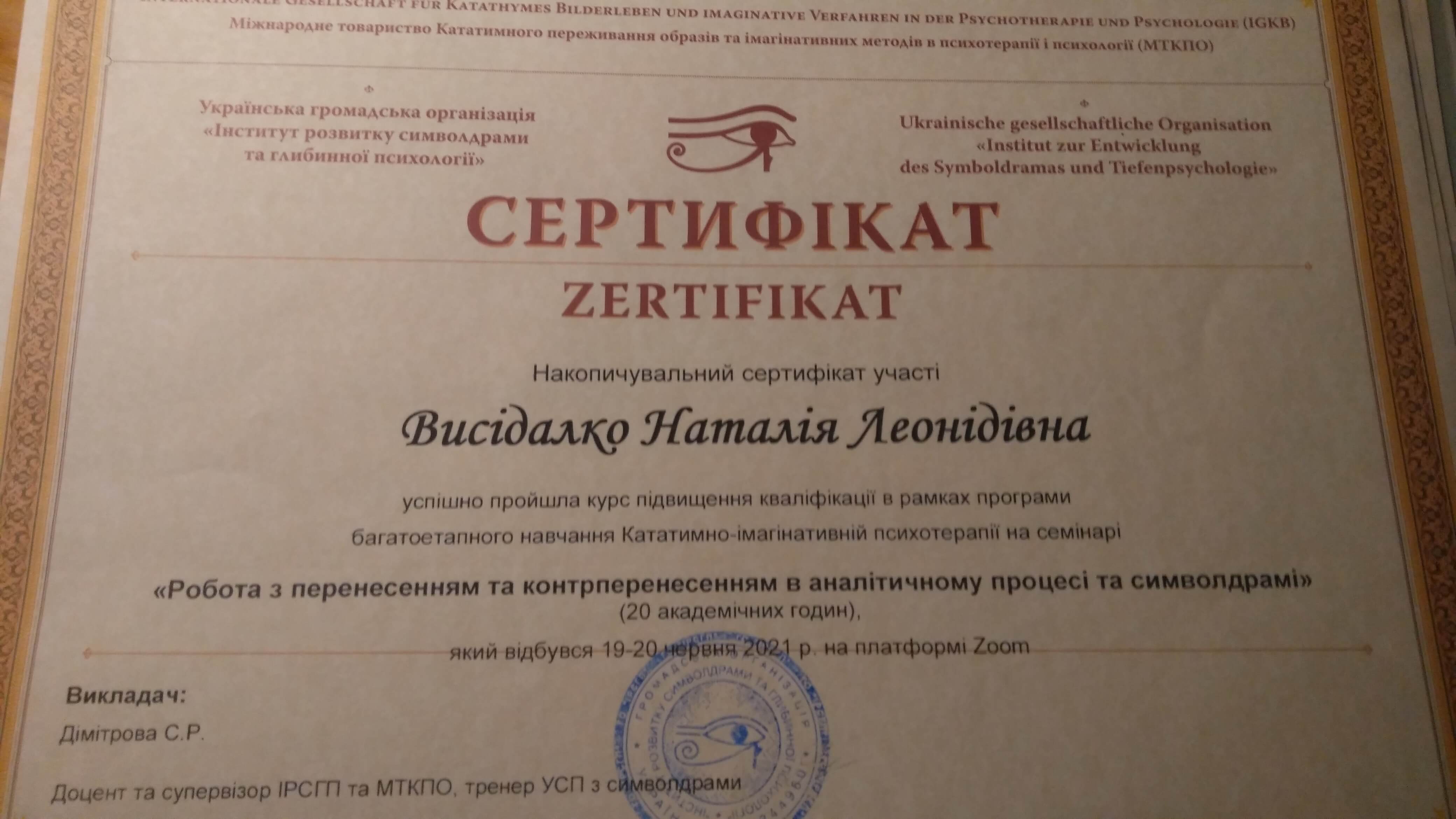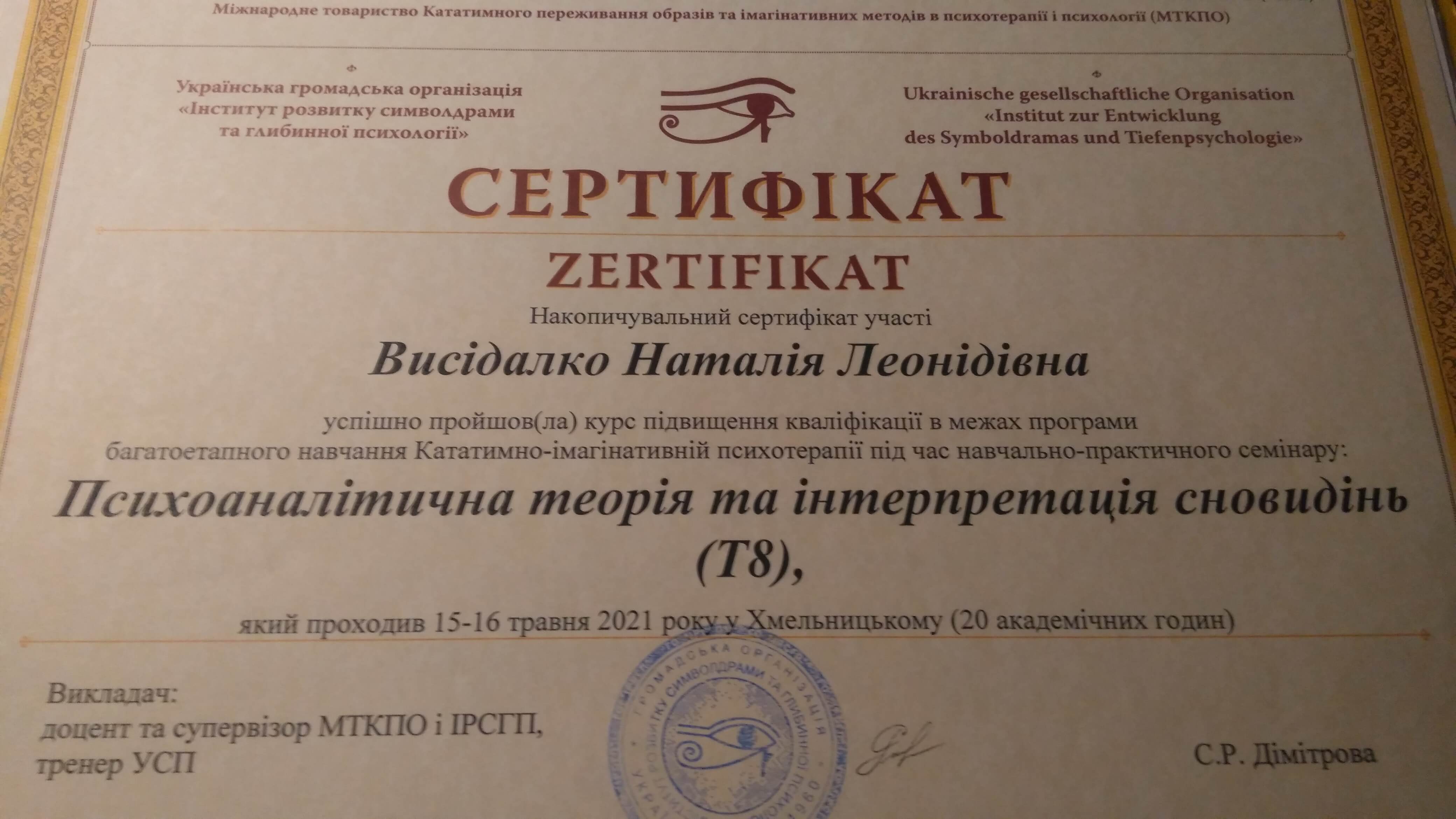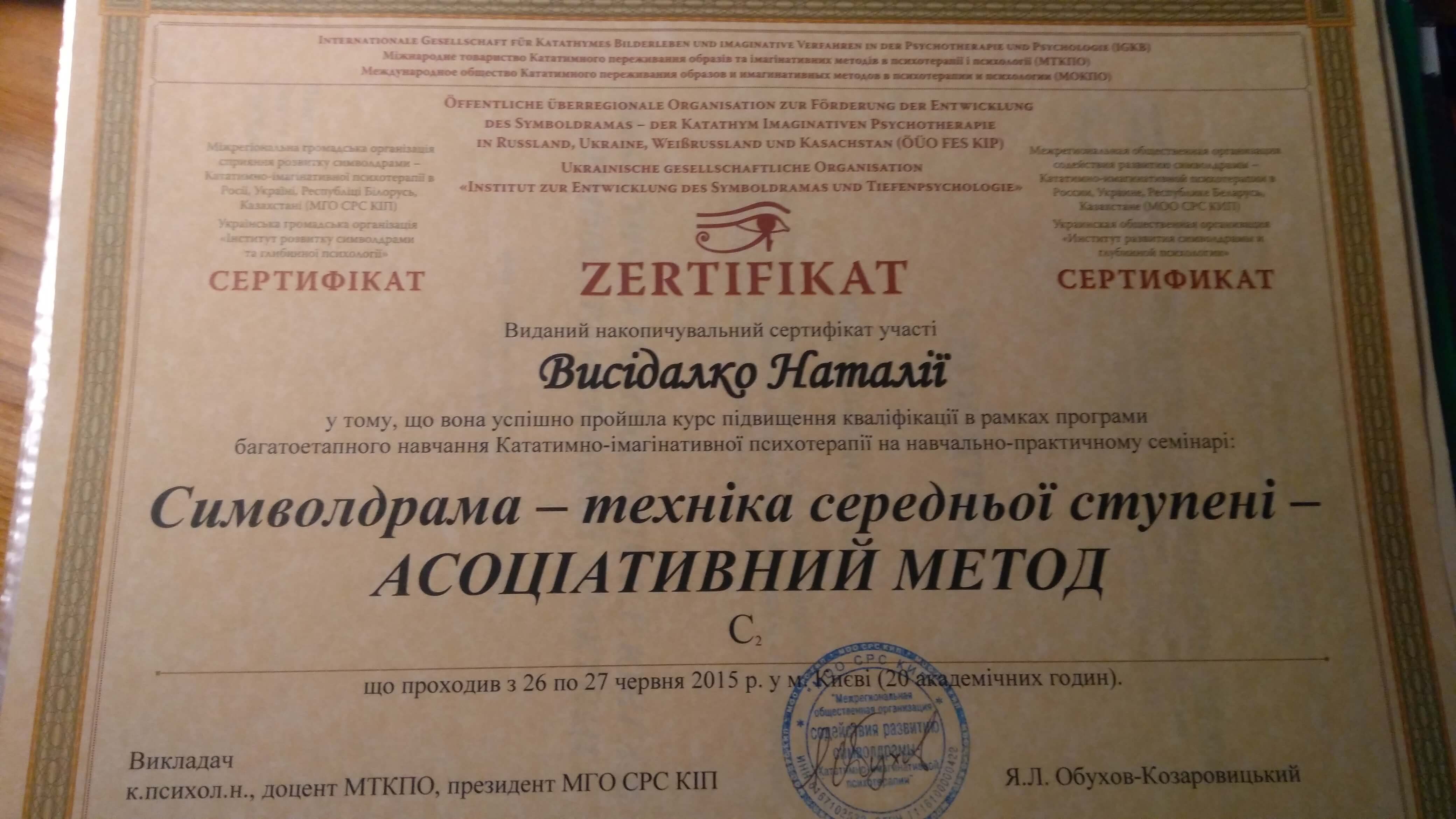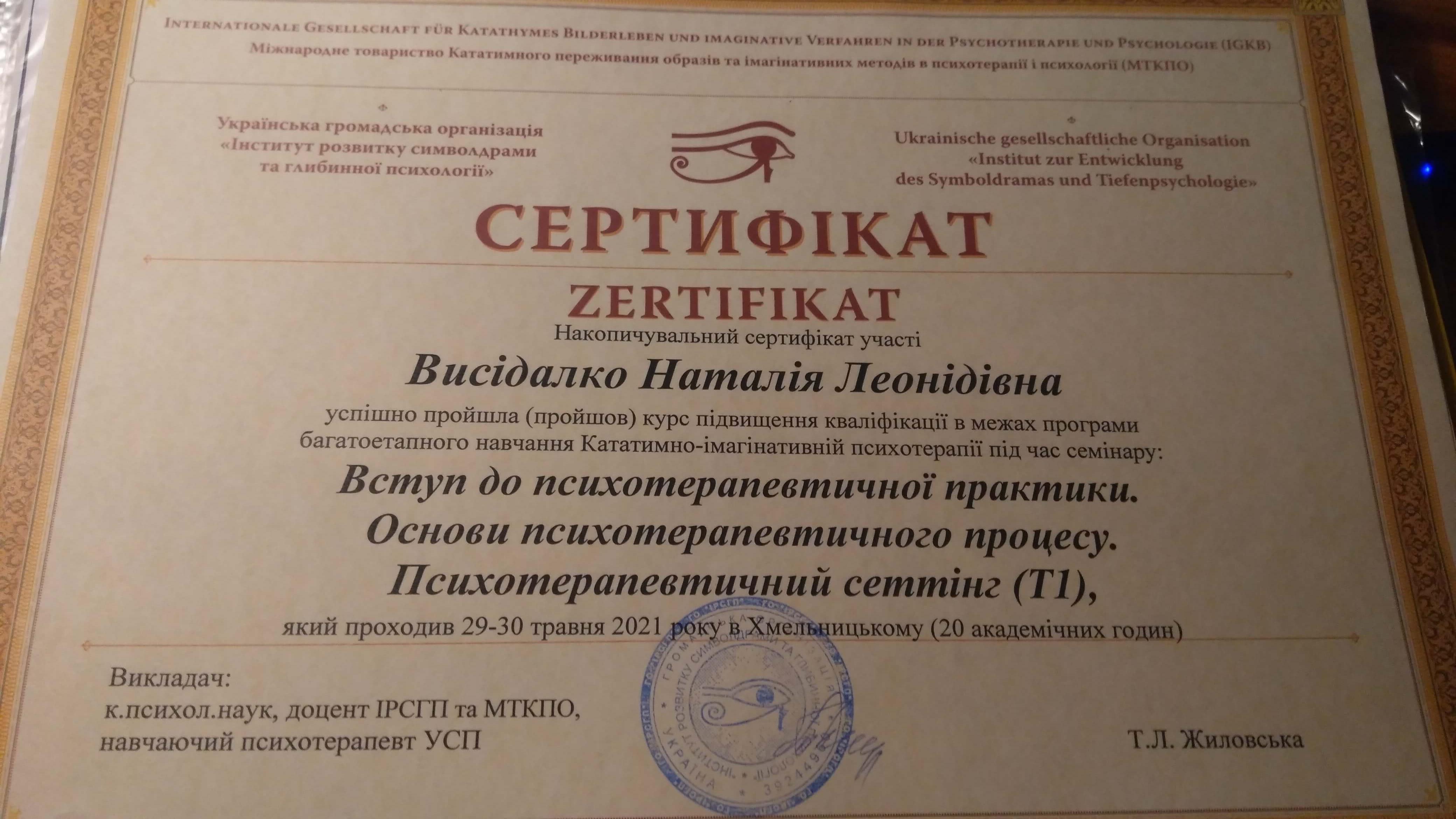 Київський міжнародний університет, спеціальність "психолог", Інститут психології імені Г.С.Костюка НАПН України, кандидат психологічних наук, PhD, Інститут розвитку символдрами та глибинної психології, підвищення кваліфікації, Центр практичної психології та психотерапії "Інсайт", Міжнародний центр гуманістичних технологій та альтернативної терапії Астралітус, Угорщина та ін.