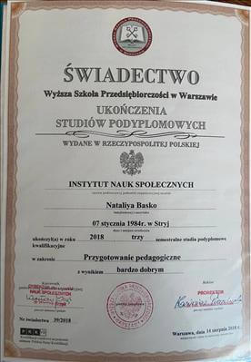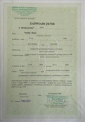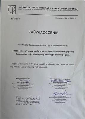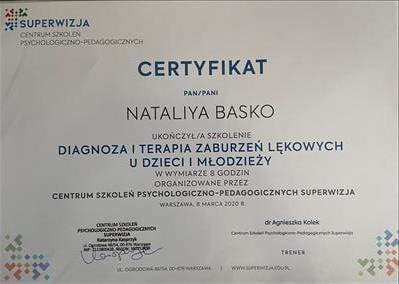 Варшавський Університет у Польщі - Варшава - після дипломної освіти «Клінічна Діагностика Дитини та Його Сім'ї», Університет Кардинала Стефана Вишинського у Варшаві - магістр психології, курс з психотравматології в Гданську (Польща) в Гданському Центрі Психотравматології, закінчила курс лікування методом „Przedłużonej ekspozycji„ , курс по роботі з жертвами насильства у Варшаві Фундація Етох, школу Ratownictwa Psychologicznego у Варшаві.