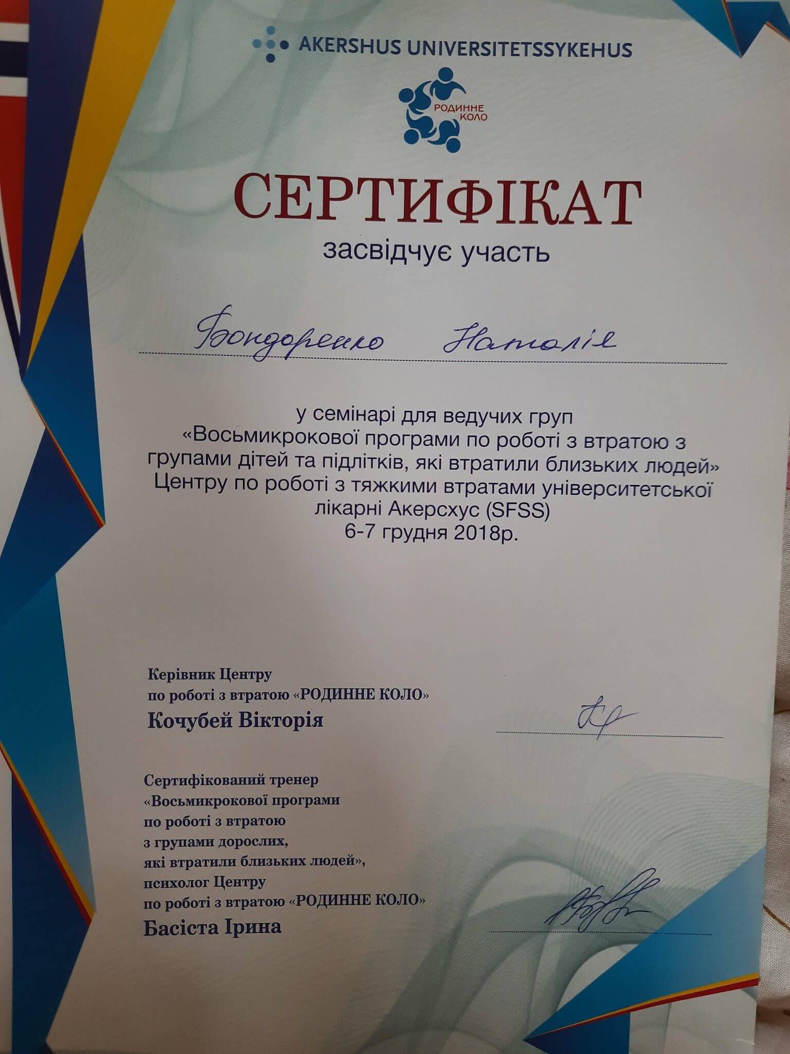 Applied Psychology Program «Практична психологія» (НаУКМА), Психотерапевтичне навчання у напрямку клієнт-центрованої терапії (Українська Асоціація психотерапевтів), Курси підвищення кваліфікації: психологія (Інститут менеджменту освіти при АПН України), кандидатська дисертація (захист Інститут політичної та соціальної психології), 5 модулів з пропедевтики (Українська Асоціація психотерапевтів; Школа розвитку психотерапії, п-н. лікарня ім. Павлова), Тренінг з роботи з травмою О. Вільвовська, Інститут соціальної та політичної психології), Тренінг з роботи з травмою (фахівці з Ізраїлю, НаУКМА), Тренінг з роботи в когнітивно-поведінковому підході CETA, робота психотерапевтом СЕТу в дослідженні (Інститут Дж. Хопкінса США, НаУКМА), навчання з супервізії 6 модулів (Тернінг з когнітивного копінгу в когнітивно-поведі нковому підході CETA з групами ветеранів (Інститут Дж. Хопкінса США, НаУКМА) горя, Тренінг Suicide Prevention TOT (Фахівці з Університетська клініка Акерсгурс, Норвегія).