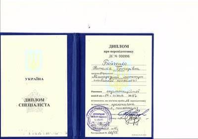 Київський Національний Університет імені Тараса Григоровича Шевченка, факультет "Психологія". Міжнародний Інститут Глибинної Психології, спеціальність "Практичний психолог (психоаналітик)".