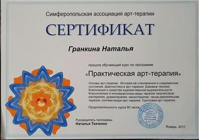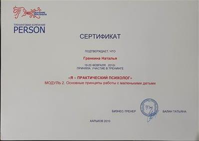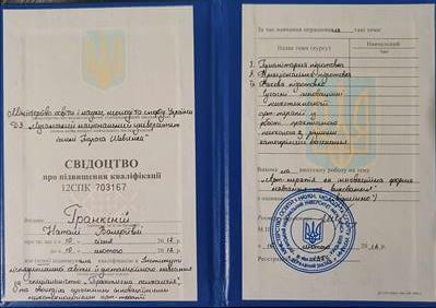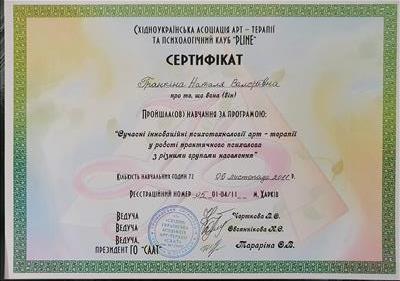 Московський інститут гештальту та психодрами: гештальт-терапевт (сертифікати 1, 2 та 3 ступенів). Навчаюся на 4 ступені (супервізія)