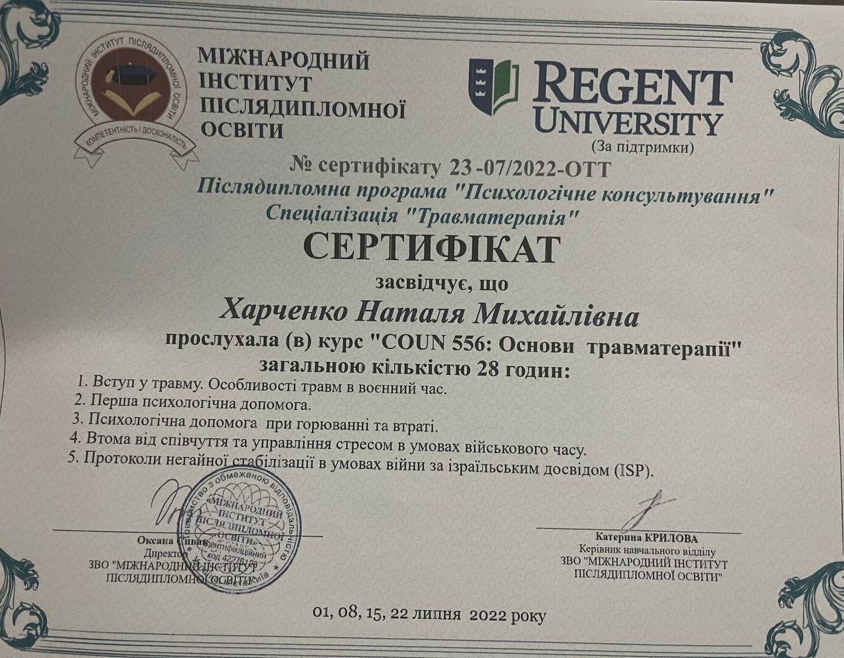 Післядипломна програма "Психологічне консультування" Спеціалізація "Травматерапія"