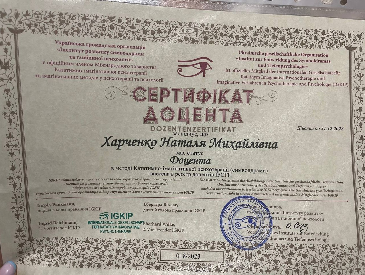 Завершила навчання та є доцентом за методом символдрамма, проводжу навчаючи семінари для молодих психологів.