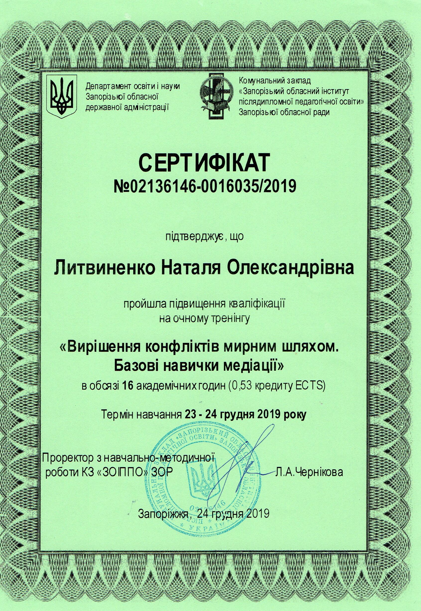 - тренінг "Вирішення конфліктів мирним шляхом. Базові навички медіації" (2019 р.);