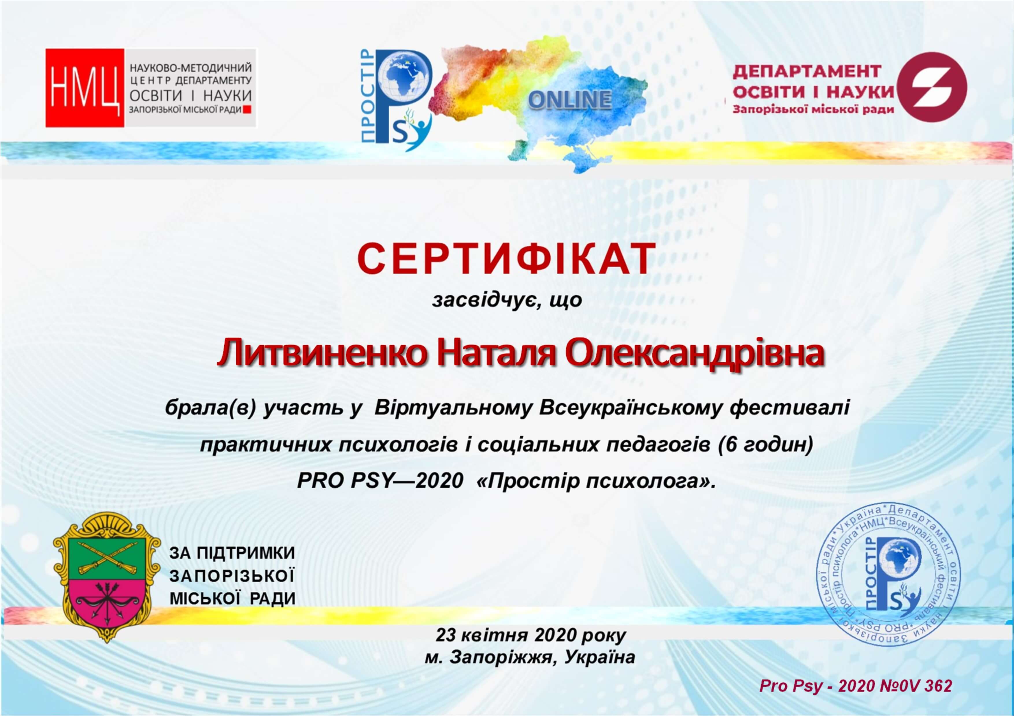 Віртуальний Всеукраїнський фестиваль практичних психологів і соціальних педагогів PRO PSY—2020 «Простір психолога»
