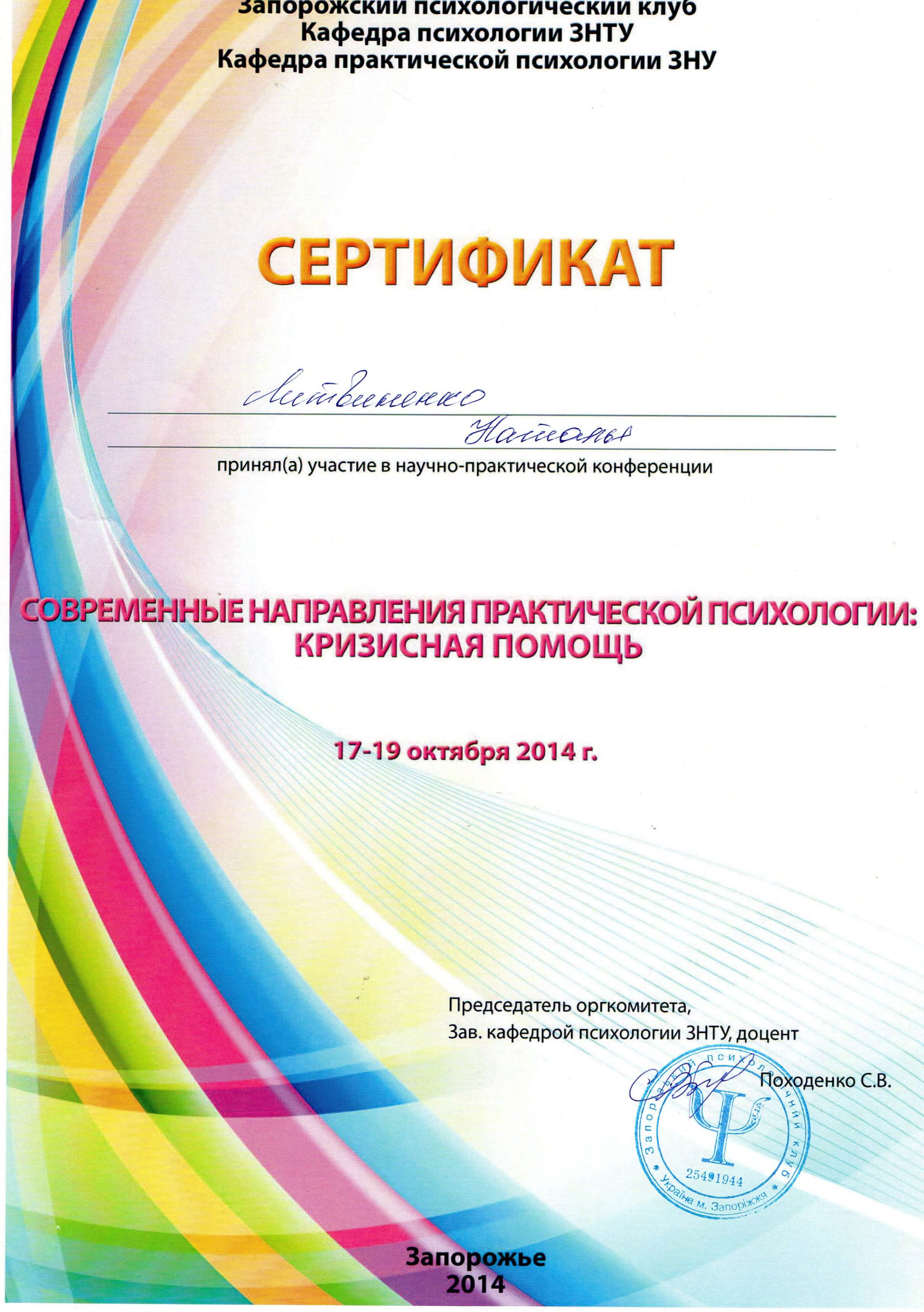 Запорізький національний технічний університет, 2016 р., спеціальність "Психологія", кваліфікація "Спеціаліст з психології"