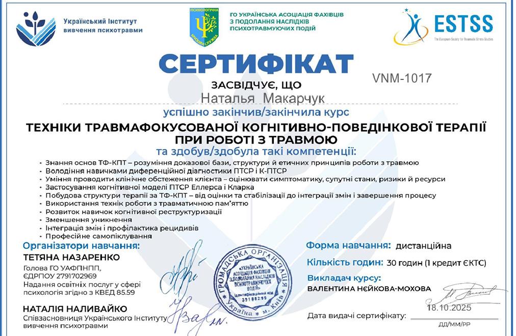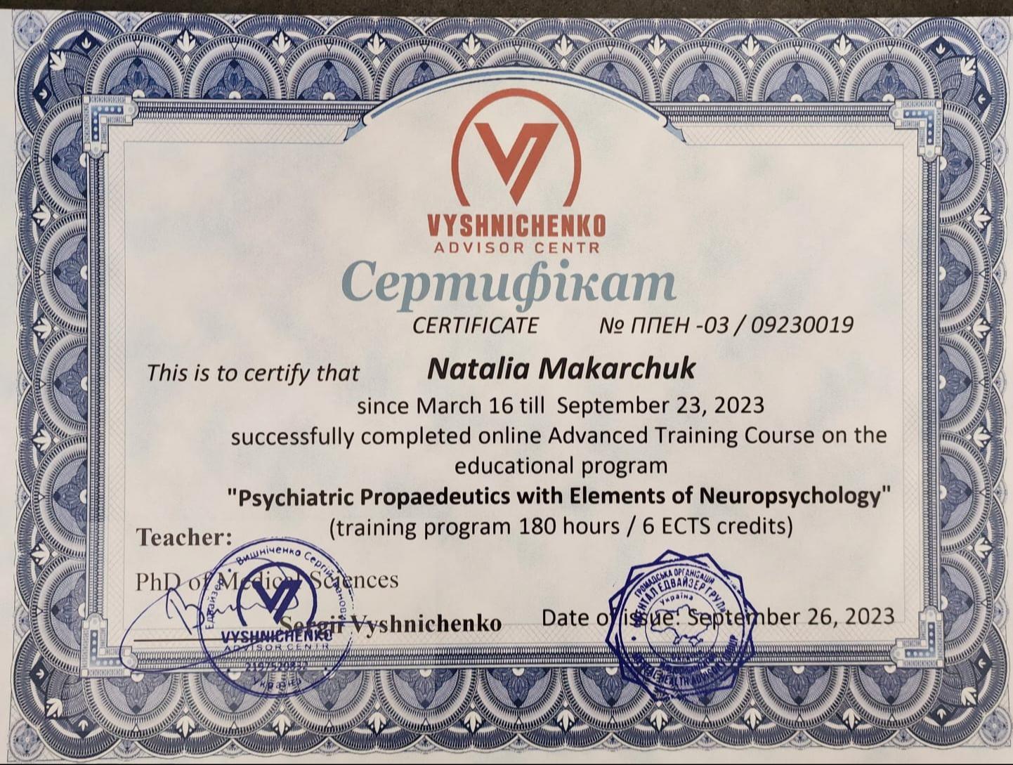 Курс з підвищення кваліфікації за програмою “Психіатрична пропедевтика з елементами нейропсихології”. За стандартами EСTS