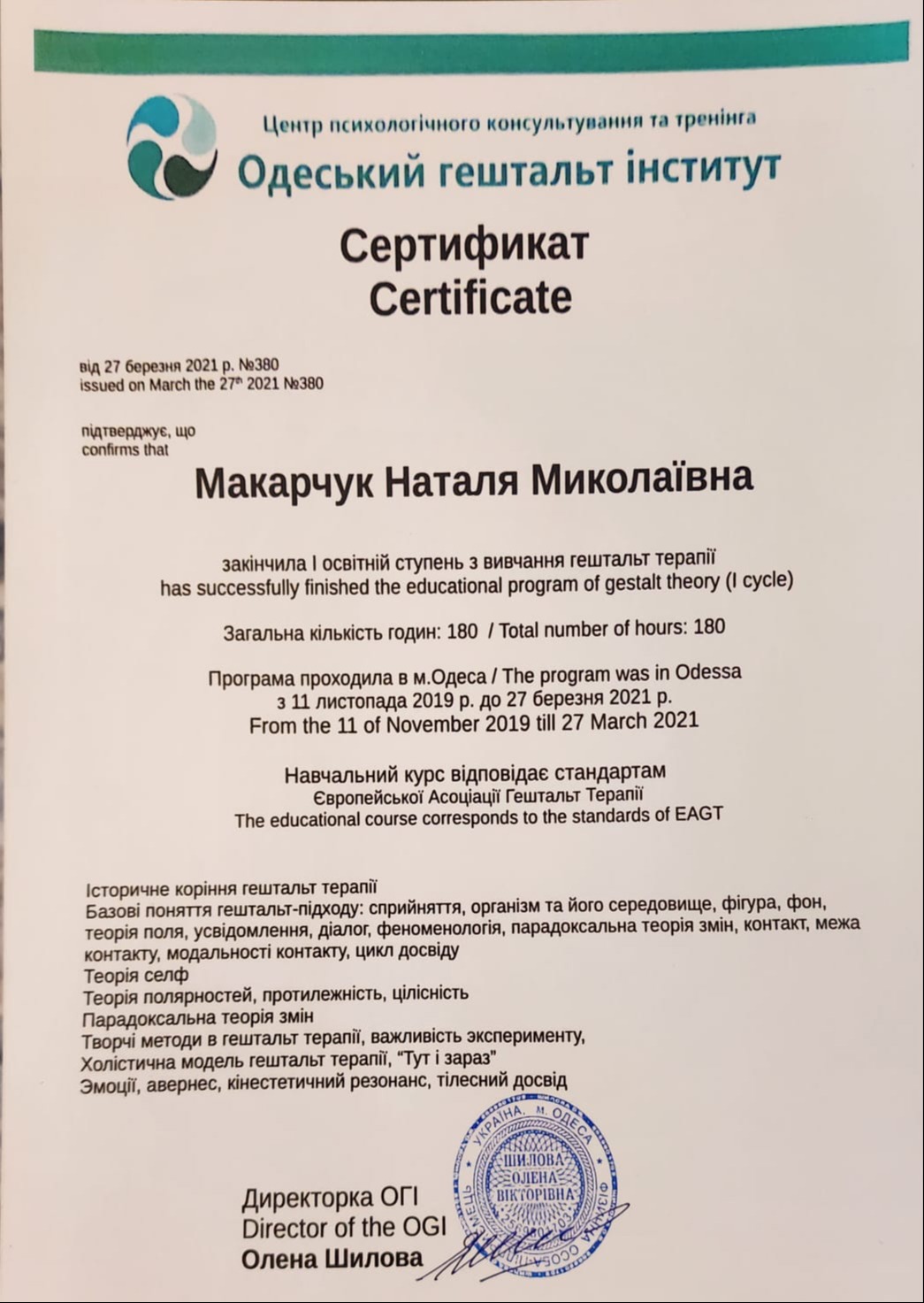 1-й освітній ступінь з гештальт терапії за стандартами EAGT.