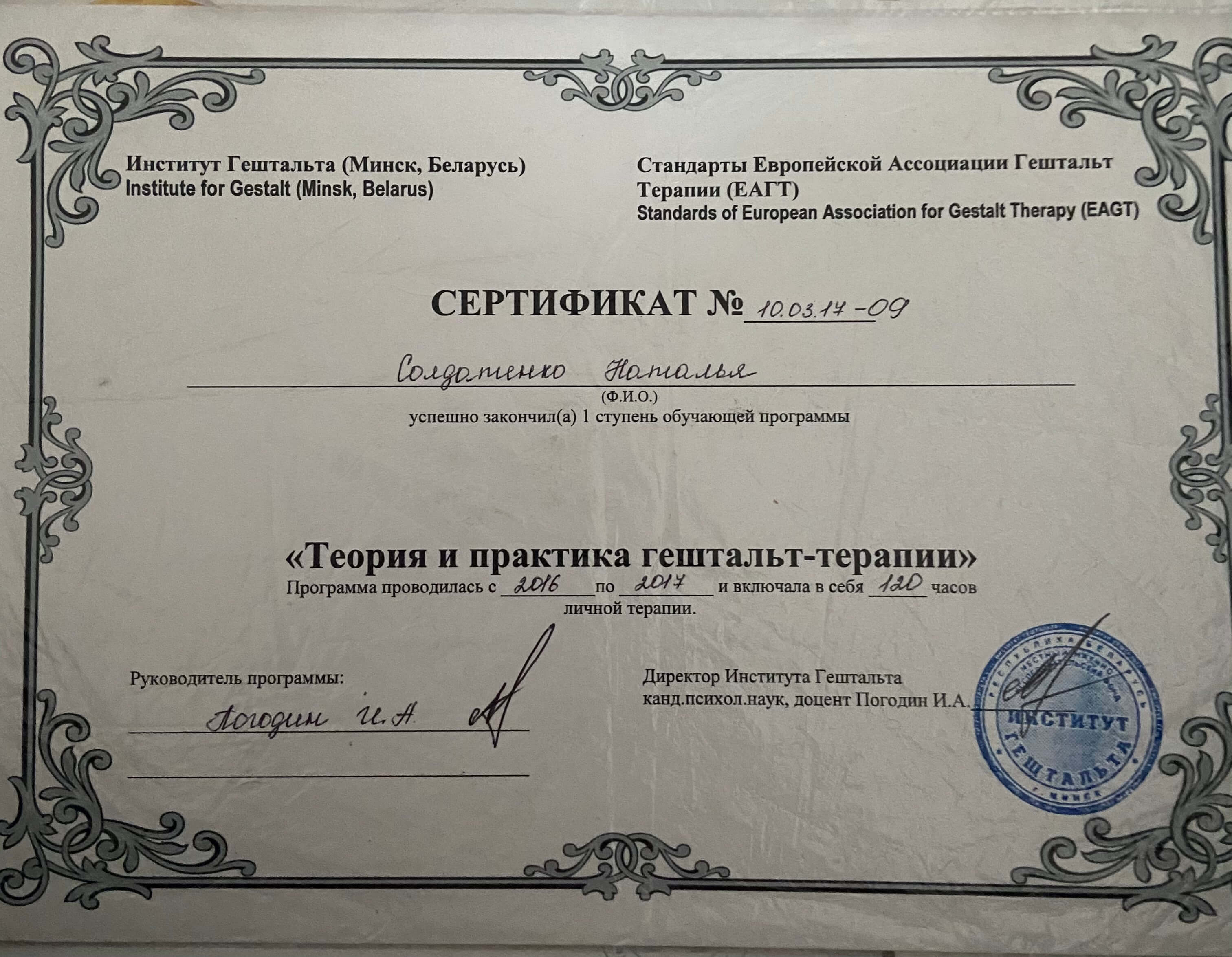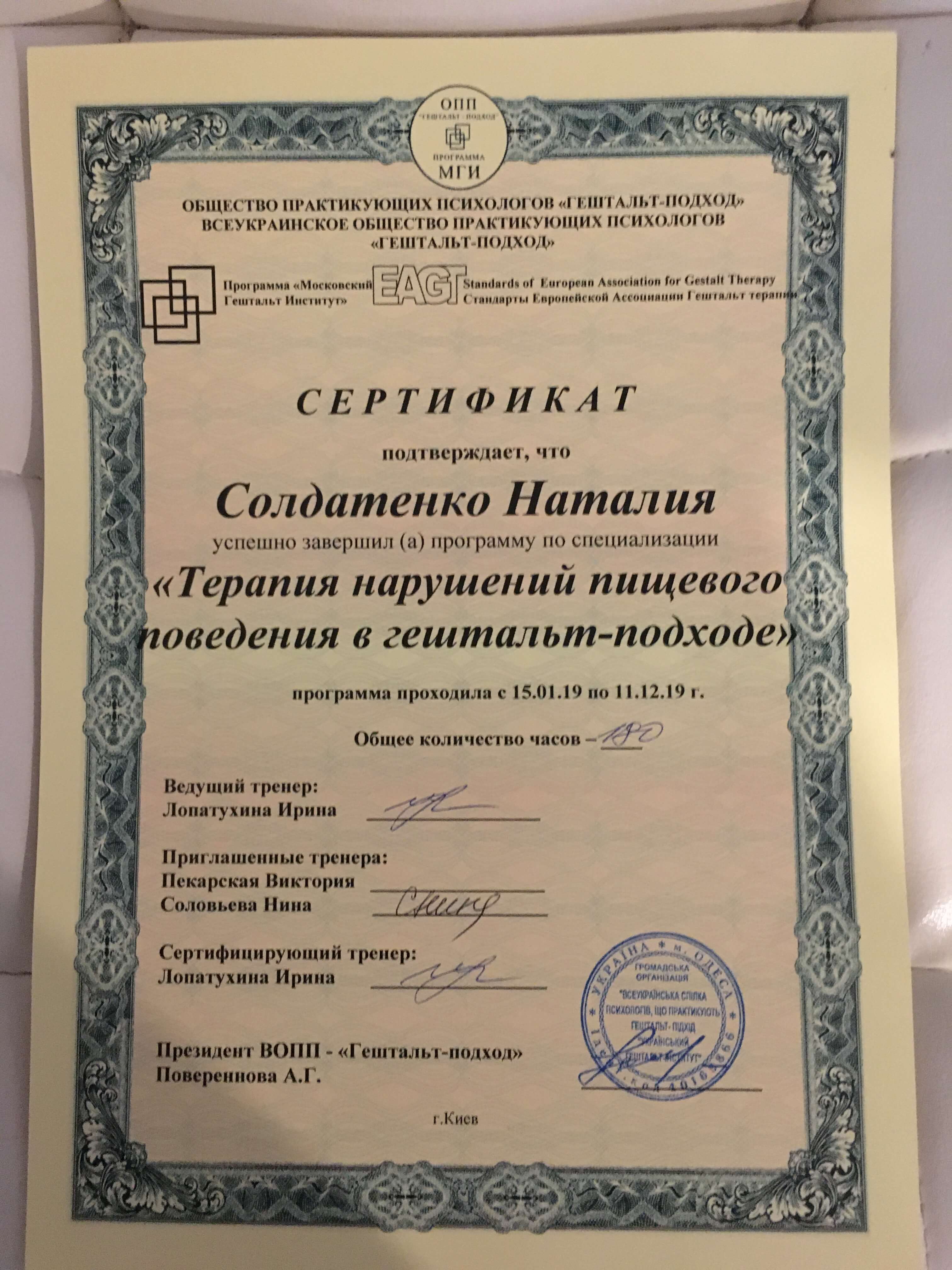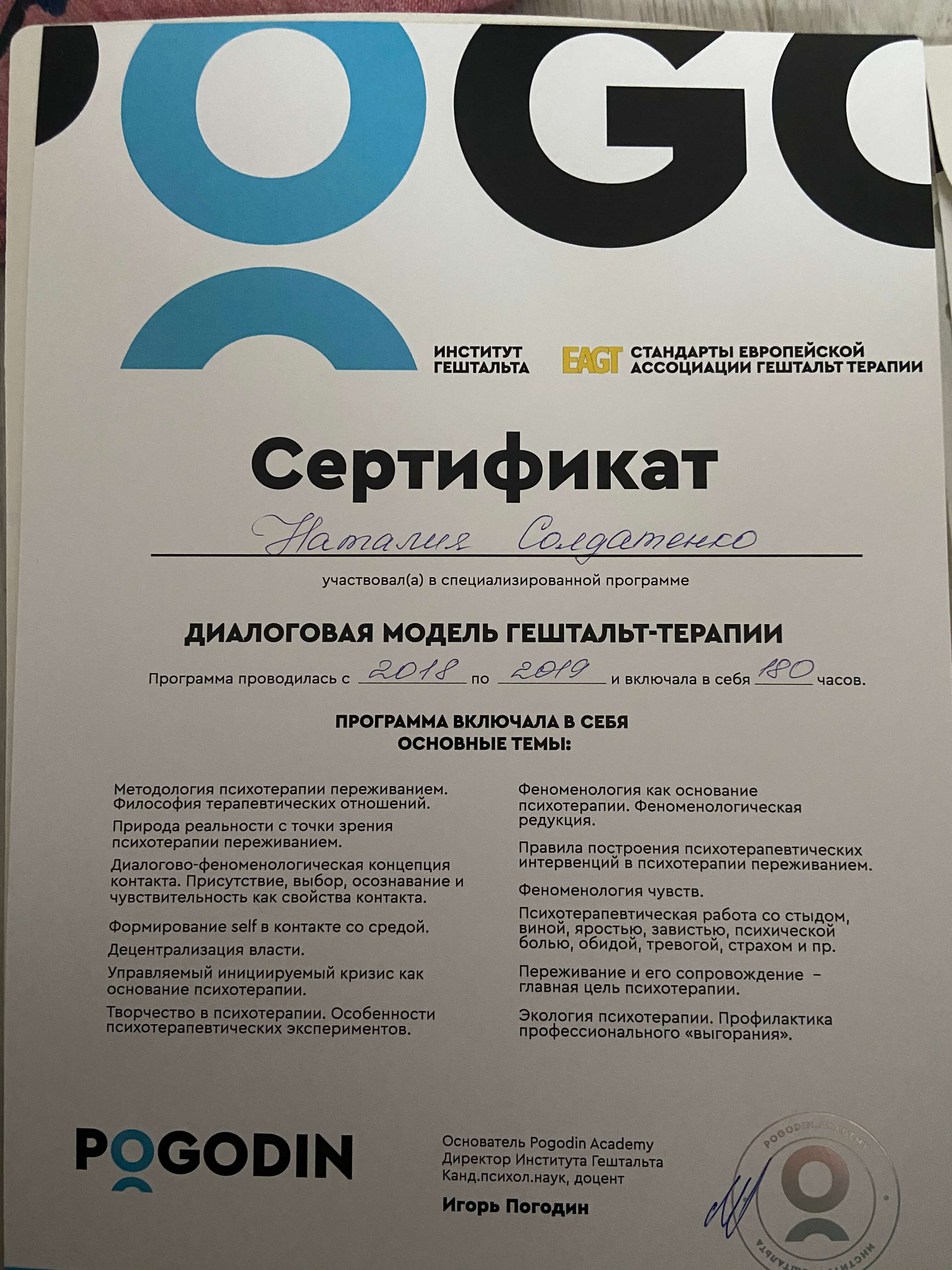 МАУП (клінічна психологи), Академія Погодіна 1,2 ступінь, Спеціалізації «Діалогово-феноменологічна модель у Гештальт-підході», ВООППГ “Терапія порушень харчової поведінки у підході Гештальт”.