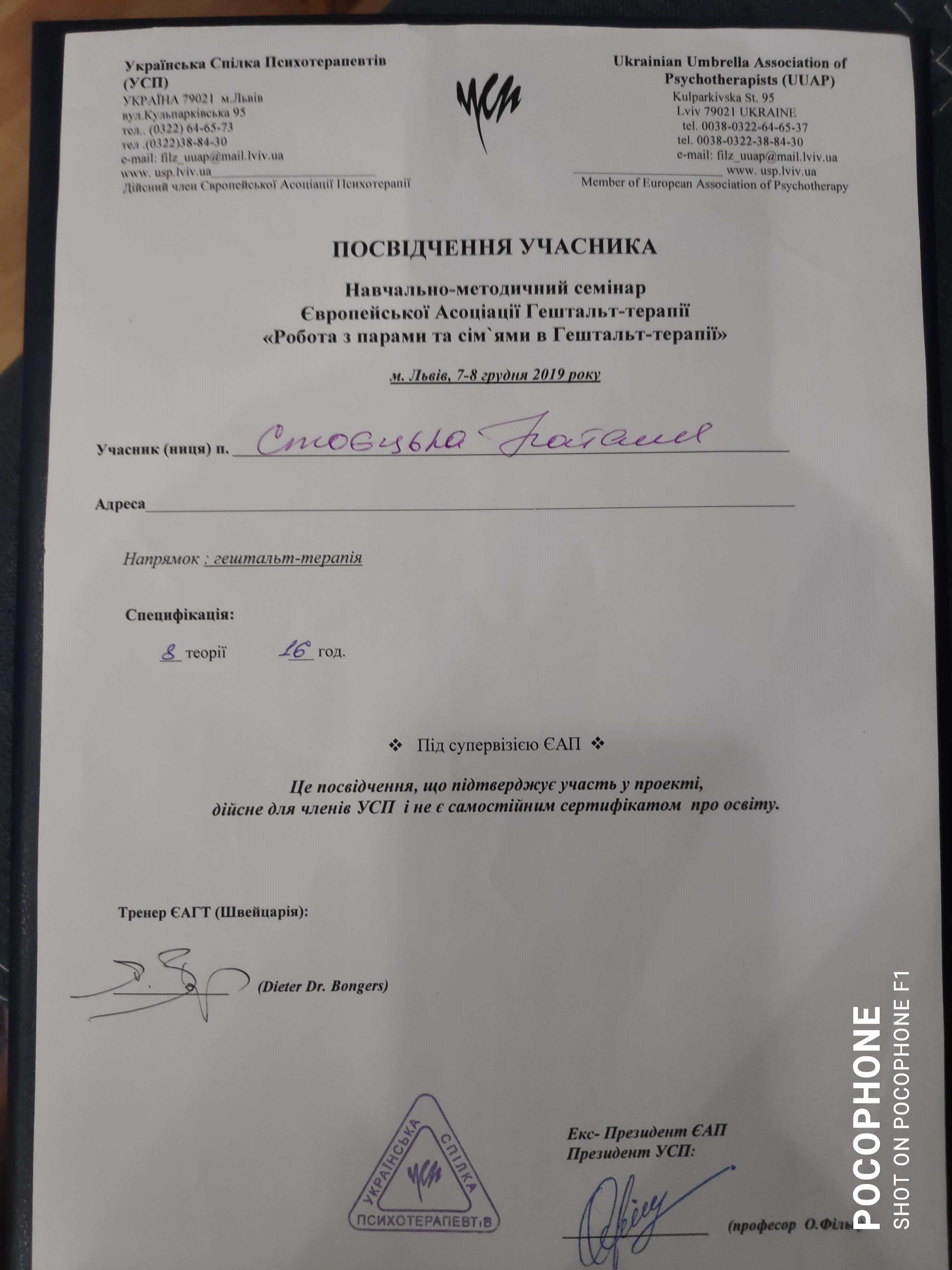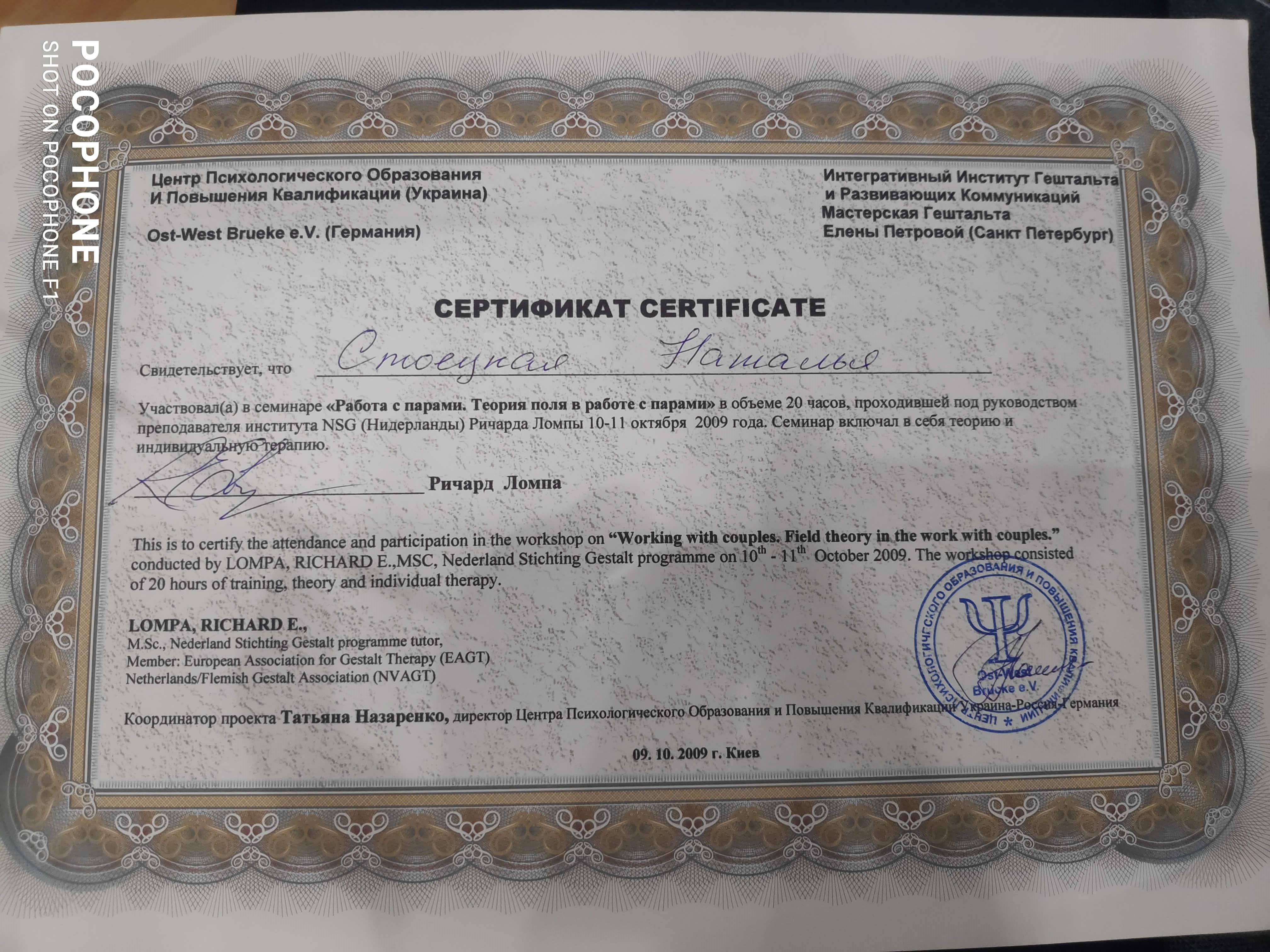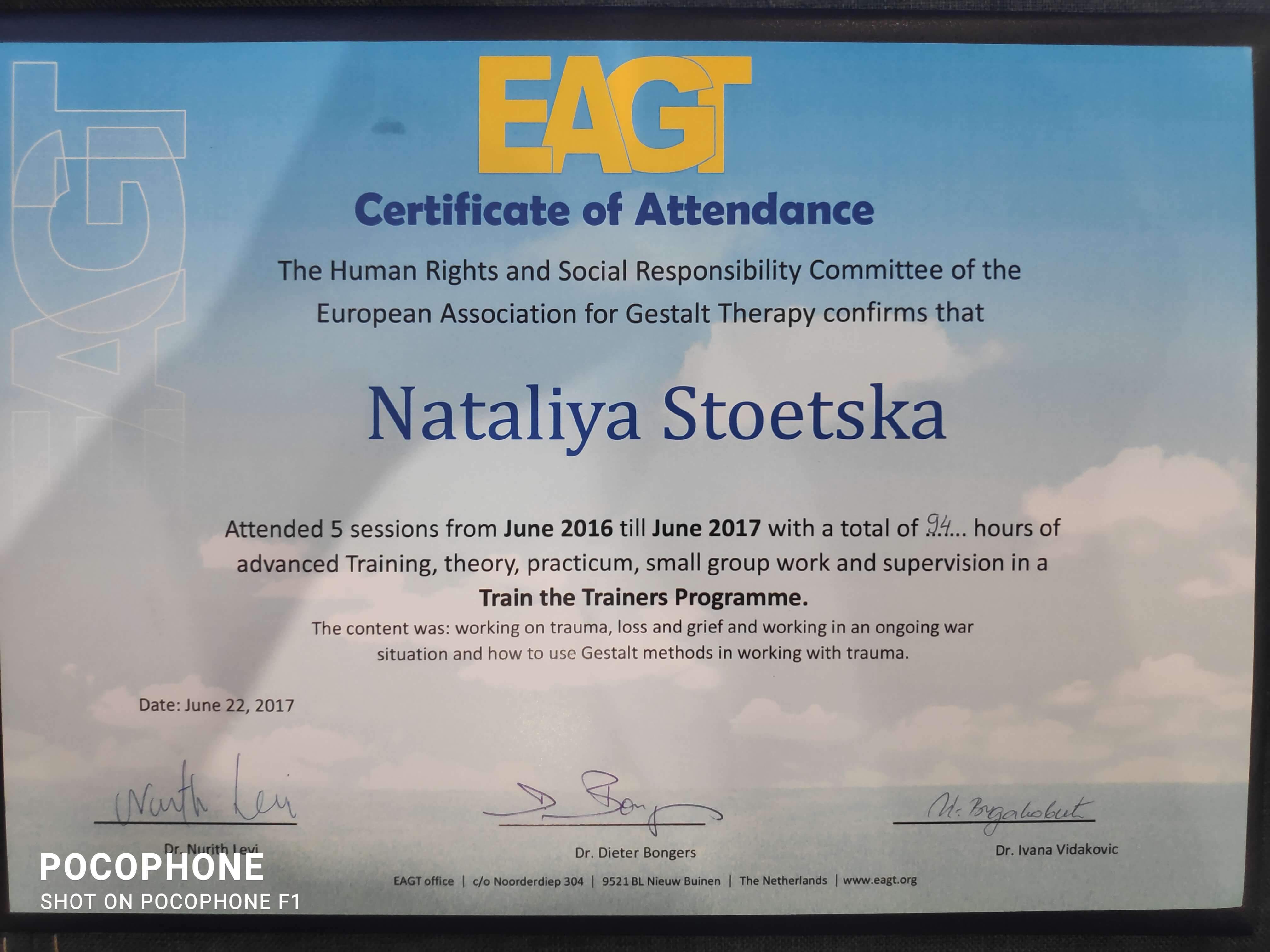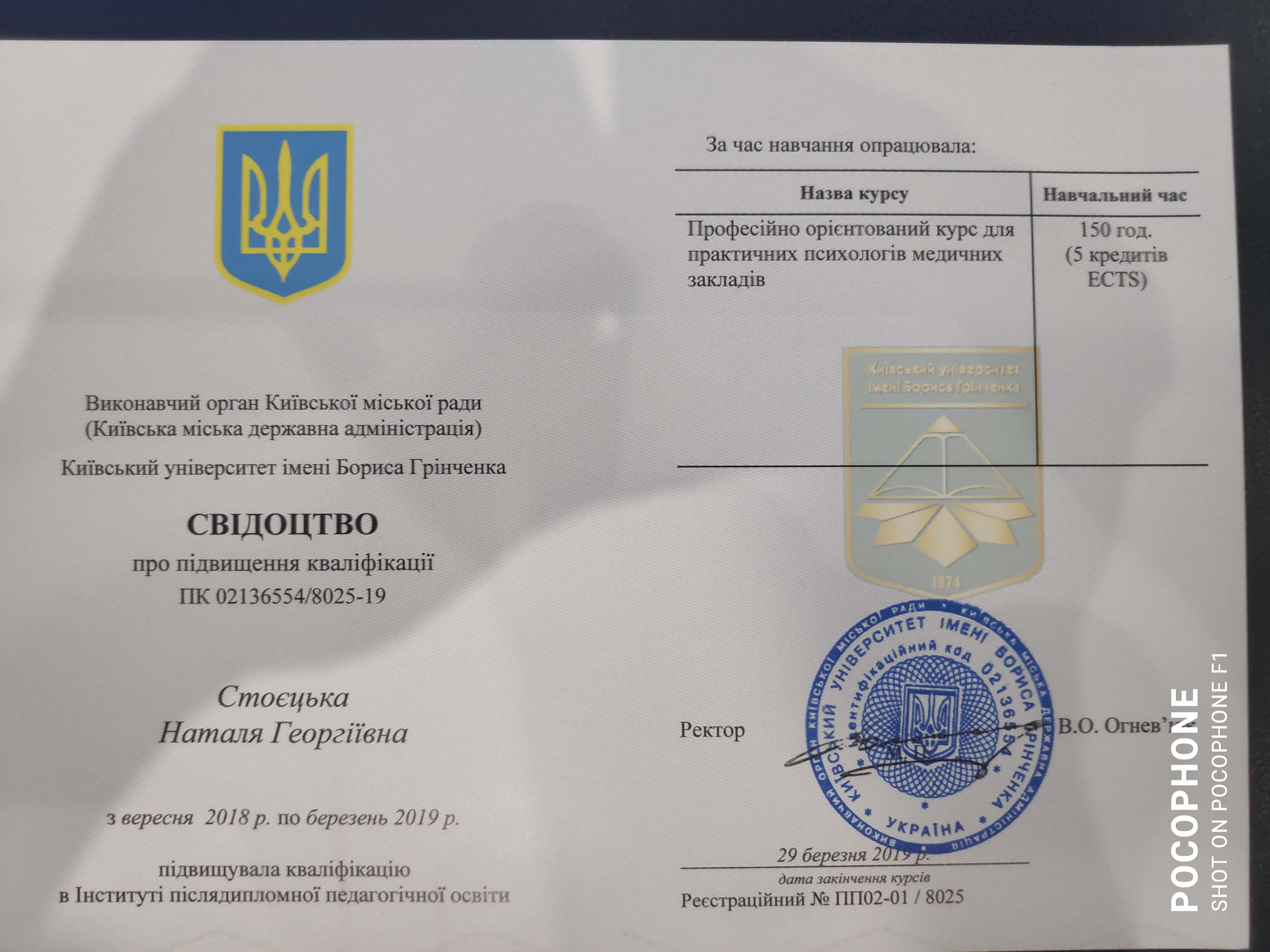 Дніпровський гуманітарний університет (магістратура), МАУП (бакалавріат), ВОППГП (терапевт, супервізор, тренер), проект EAGT (робота з травмою), курси підвищення кваліфікації (психолог 1 категорії).