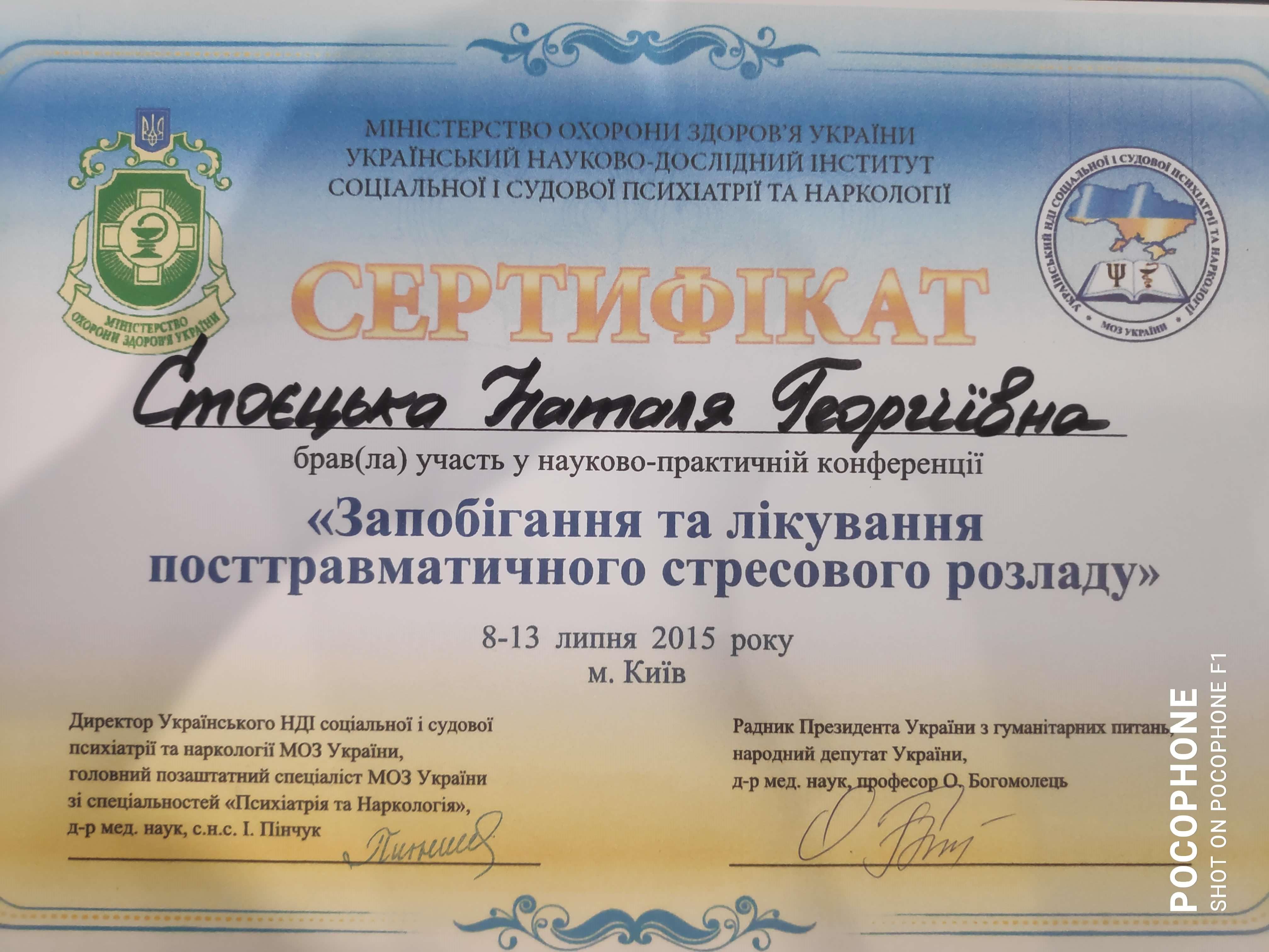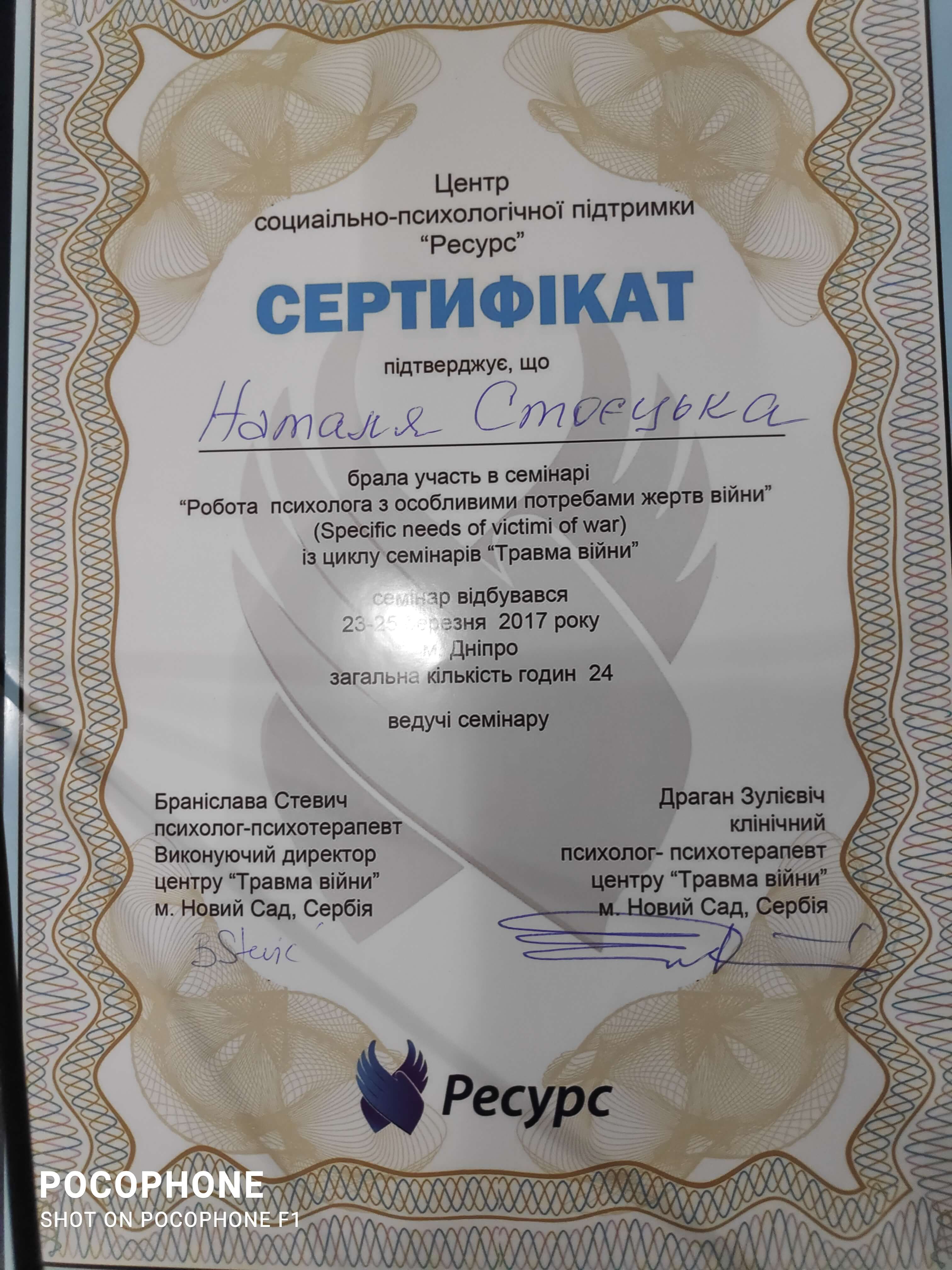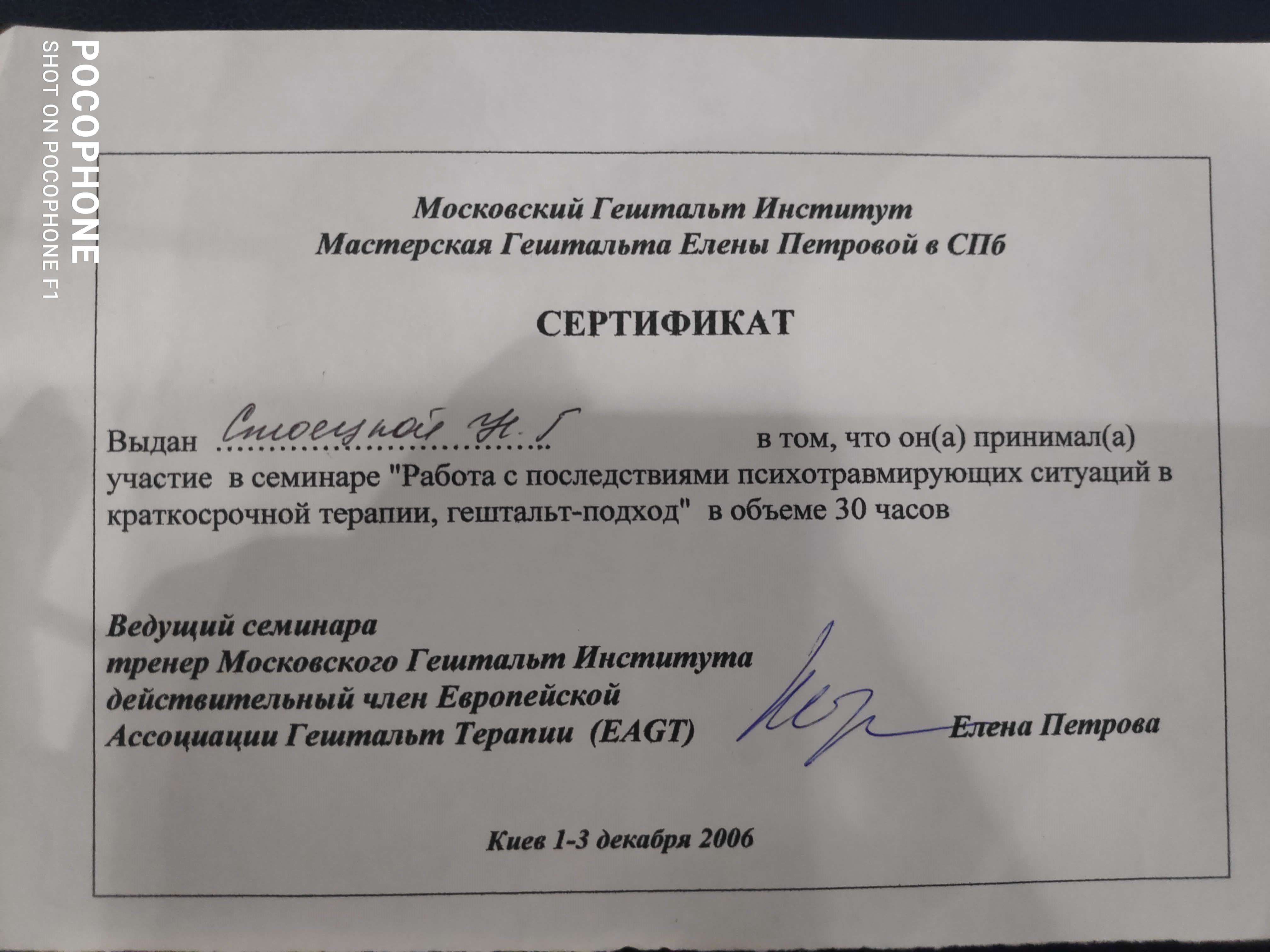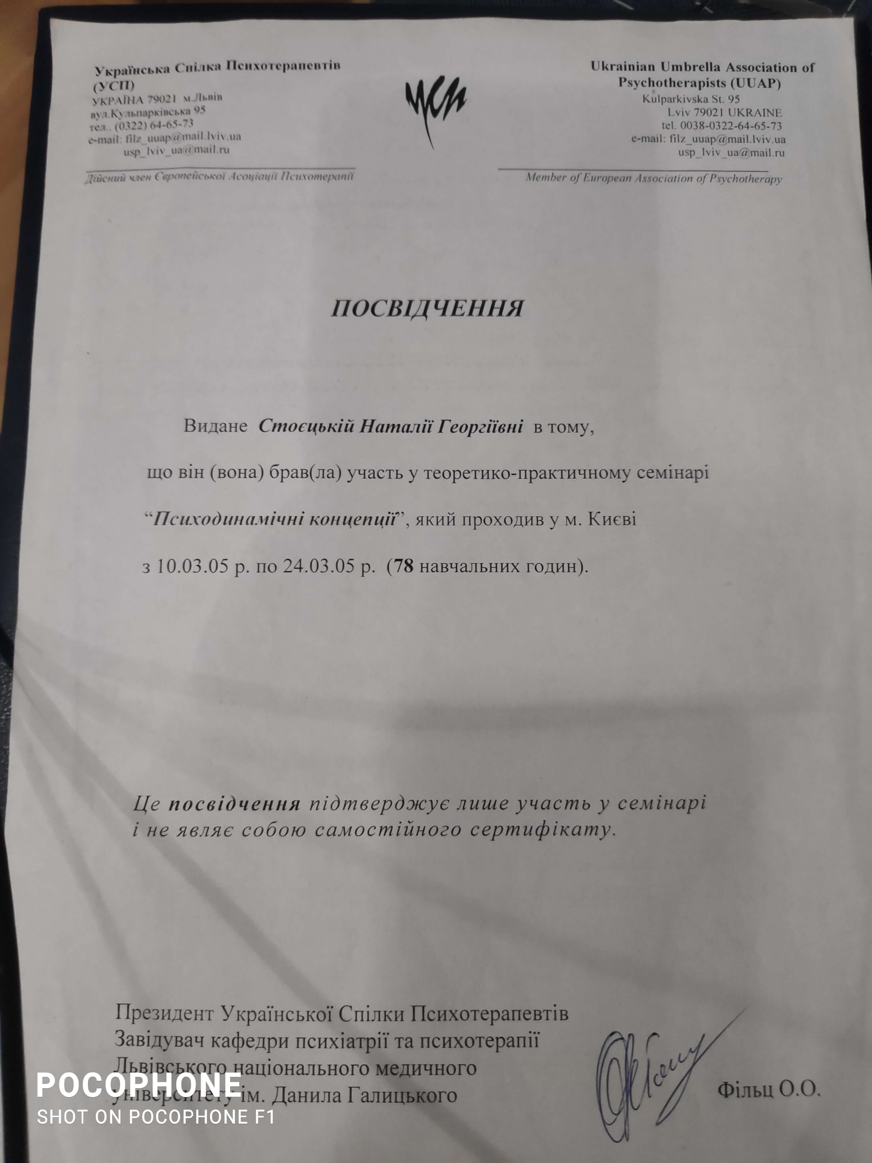 Дніпровський гуманітарний університет (магістратура), МАУП (бакалавріат), ВОППГП (терапевт, супервізор, тренер), проект EAGT (робота з травмою), курси підвищення кваліфікації (психолог 1 категорії).