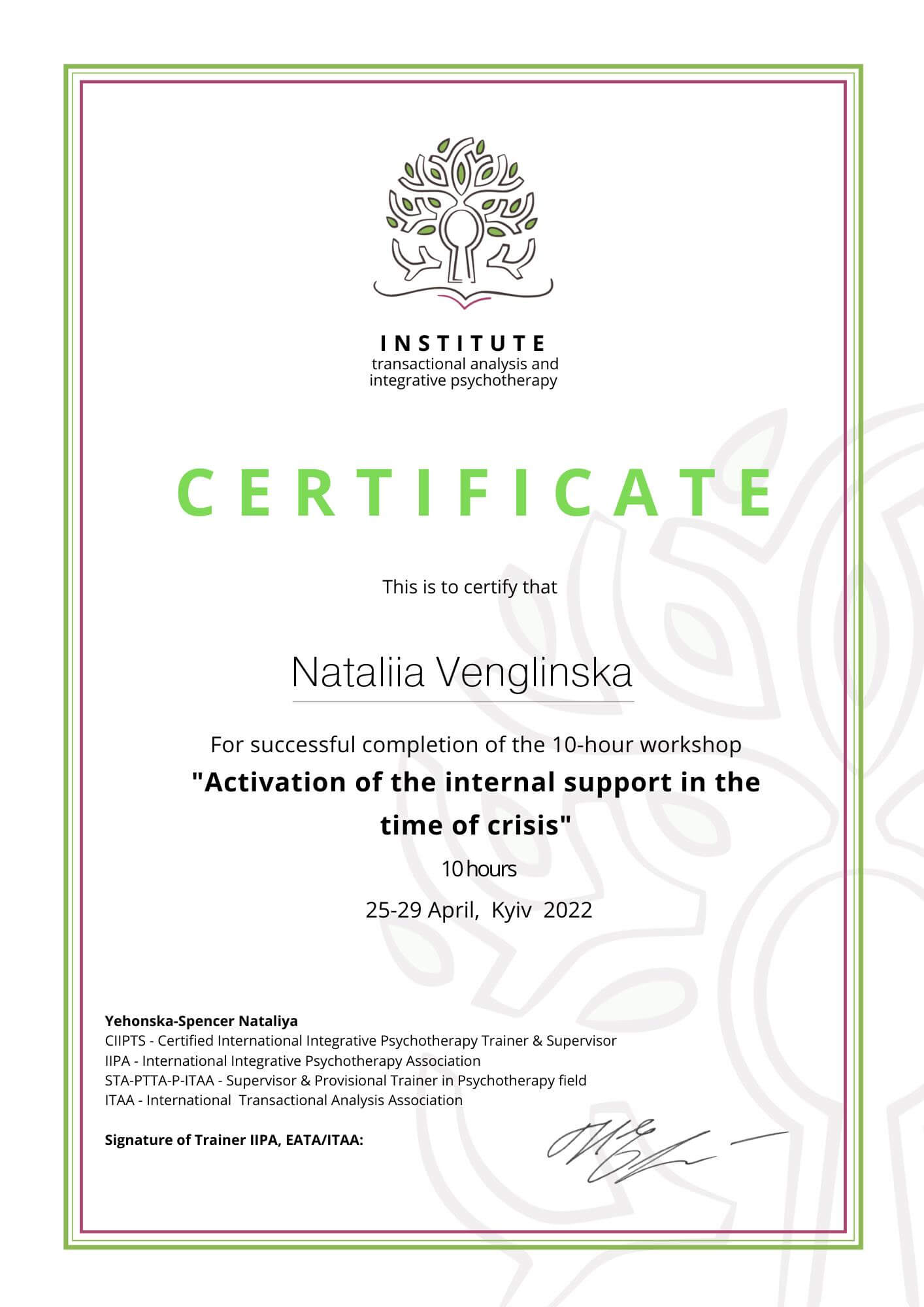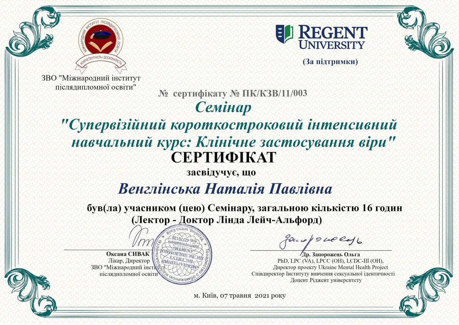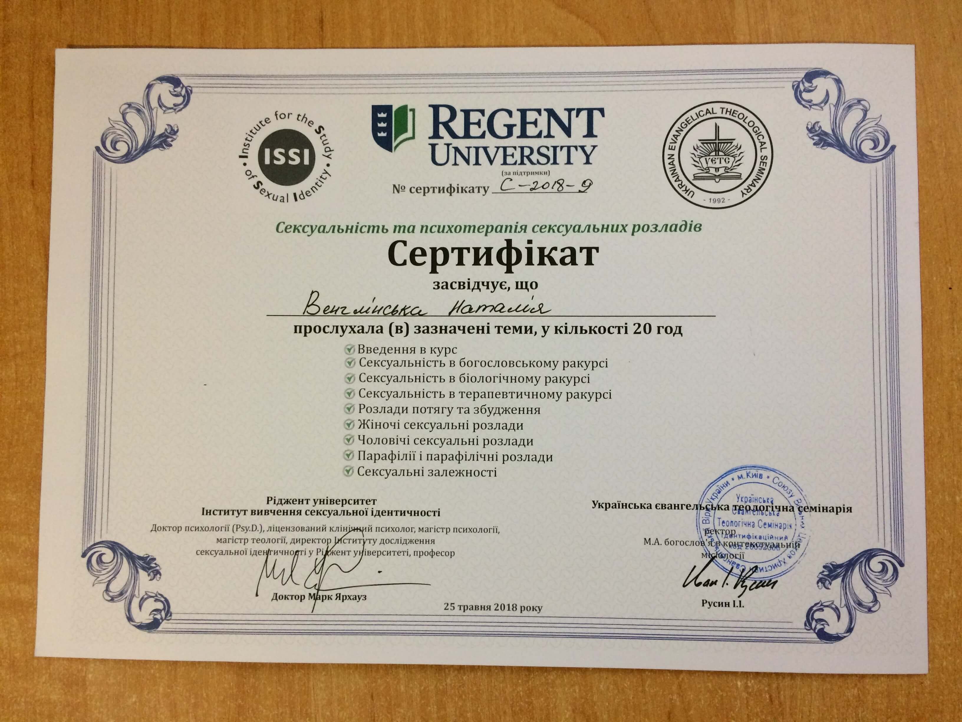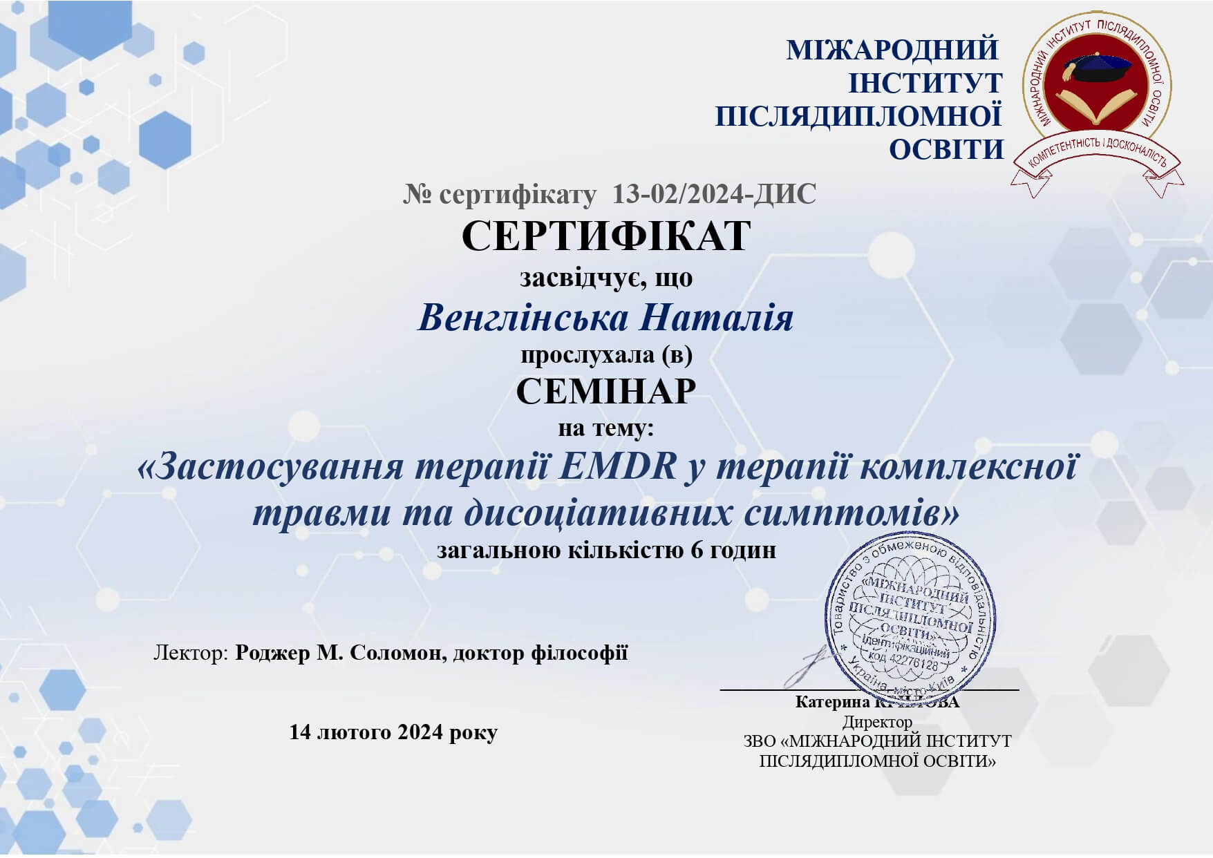 - Міжнародний Інститут Післядипломної Освіти (травматерапія; робота з адикціями; групова терапія)