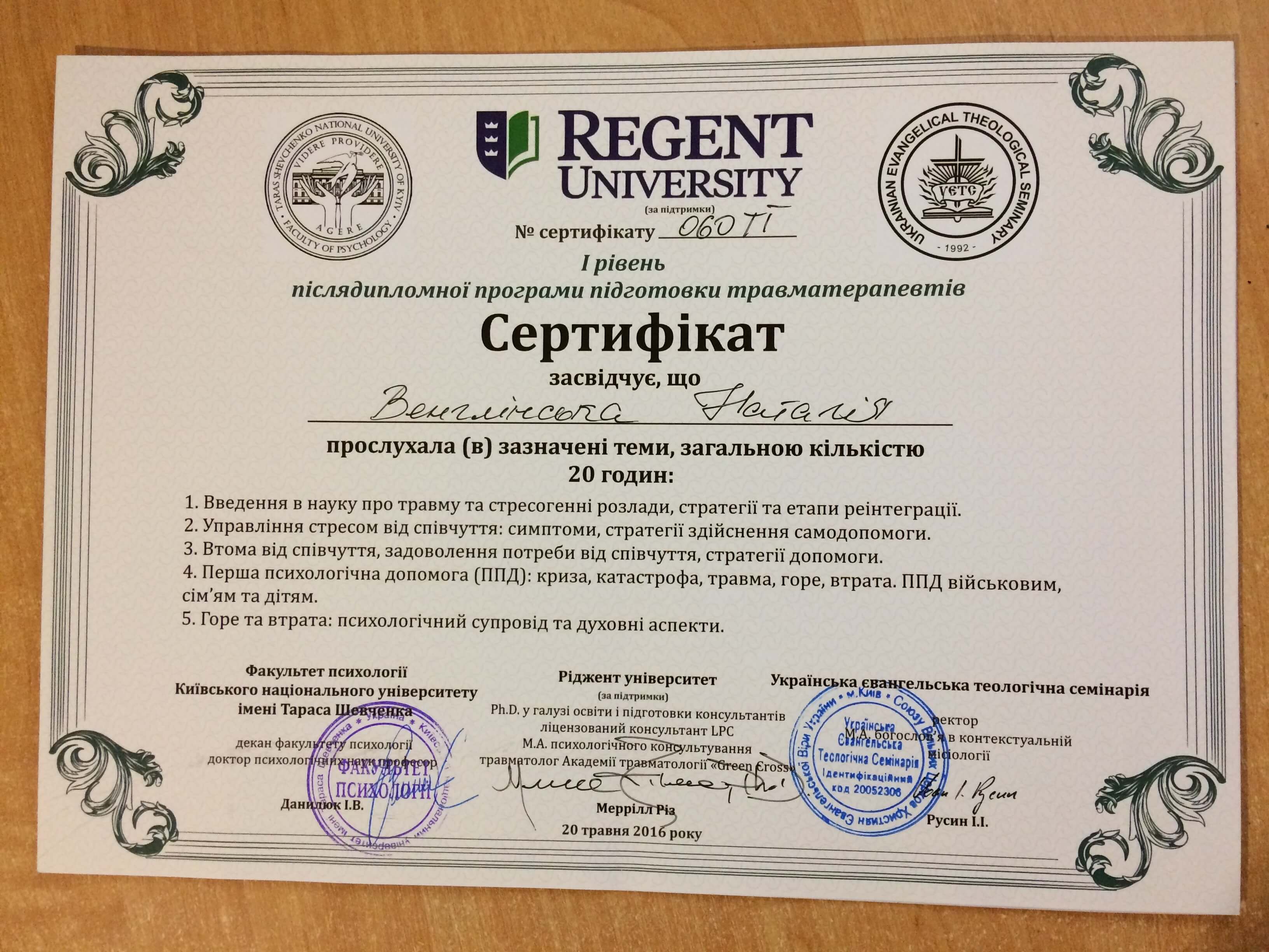 - Regent University (травматерапія; EMDR; сімейна терапія)