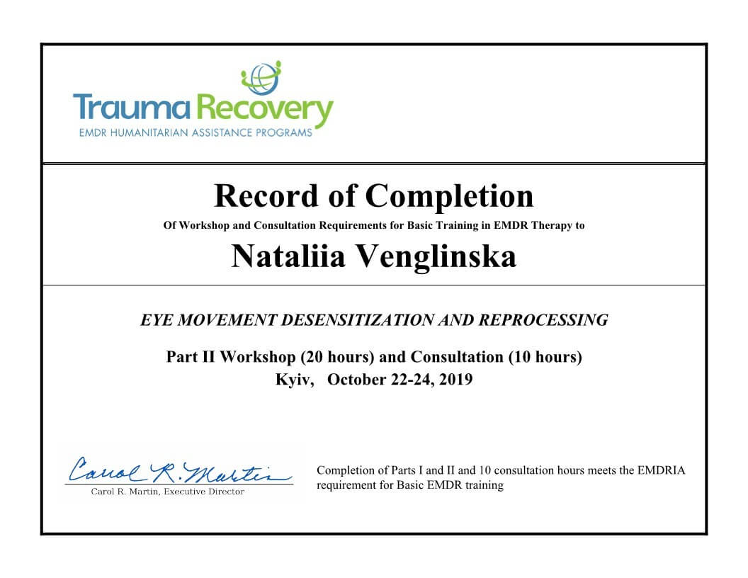 Закінчила Міжнародний інститут післядипломної освіти за фахом травмотерапевт та EMDR терапевт.