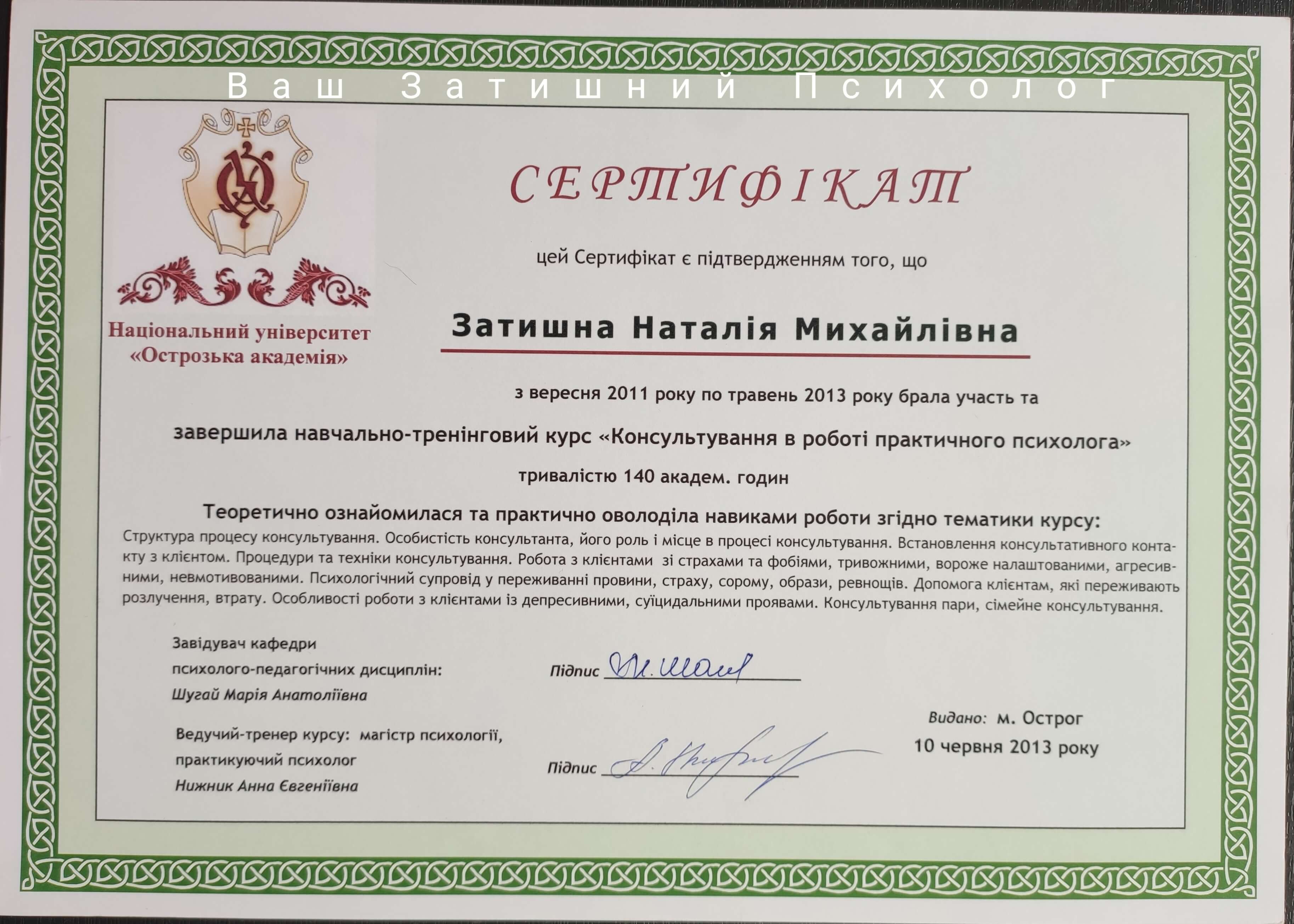 Закінчена вища освіта (магістр психології) Національний університет "Острозька академія" - спеціальність "Вікова та педагогічна психологія"