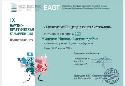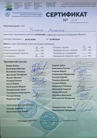 Терапевтичний інтенсив «Одіссея Гештальта», 11 днів інтенсивної терапевтичної роботи, проходила 3 рази, як у ролі клієнта, і у ролі терапевта.