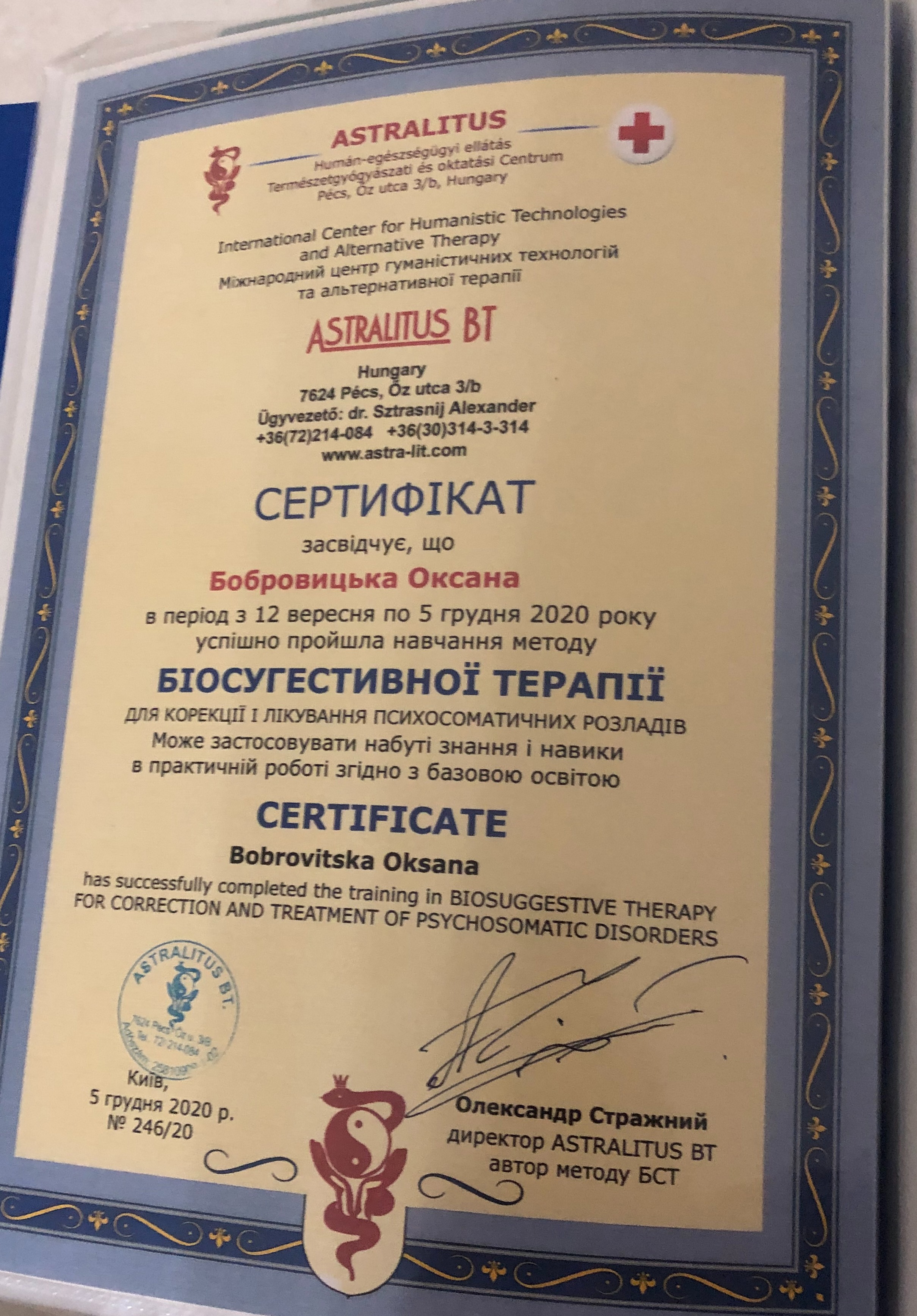Вересень-грудень 2020 року успішно пройшла навчання методу Біосугестивної терапії для корекції і лікування психосоматичних розладів, Міжнародний центр гуманістичних технологій та альтернативної терапії (сертифікат).