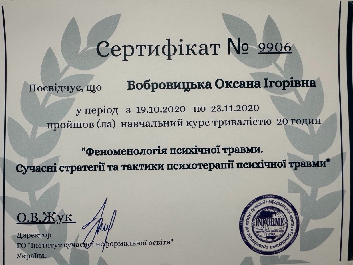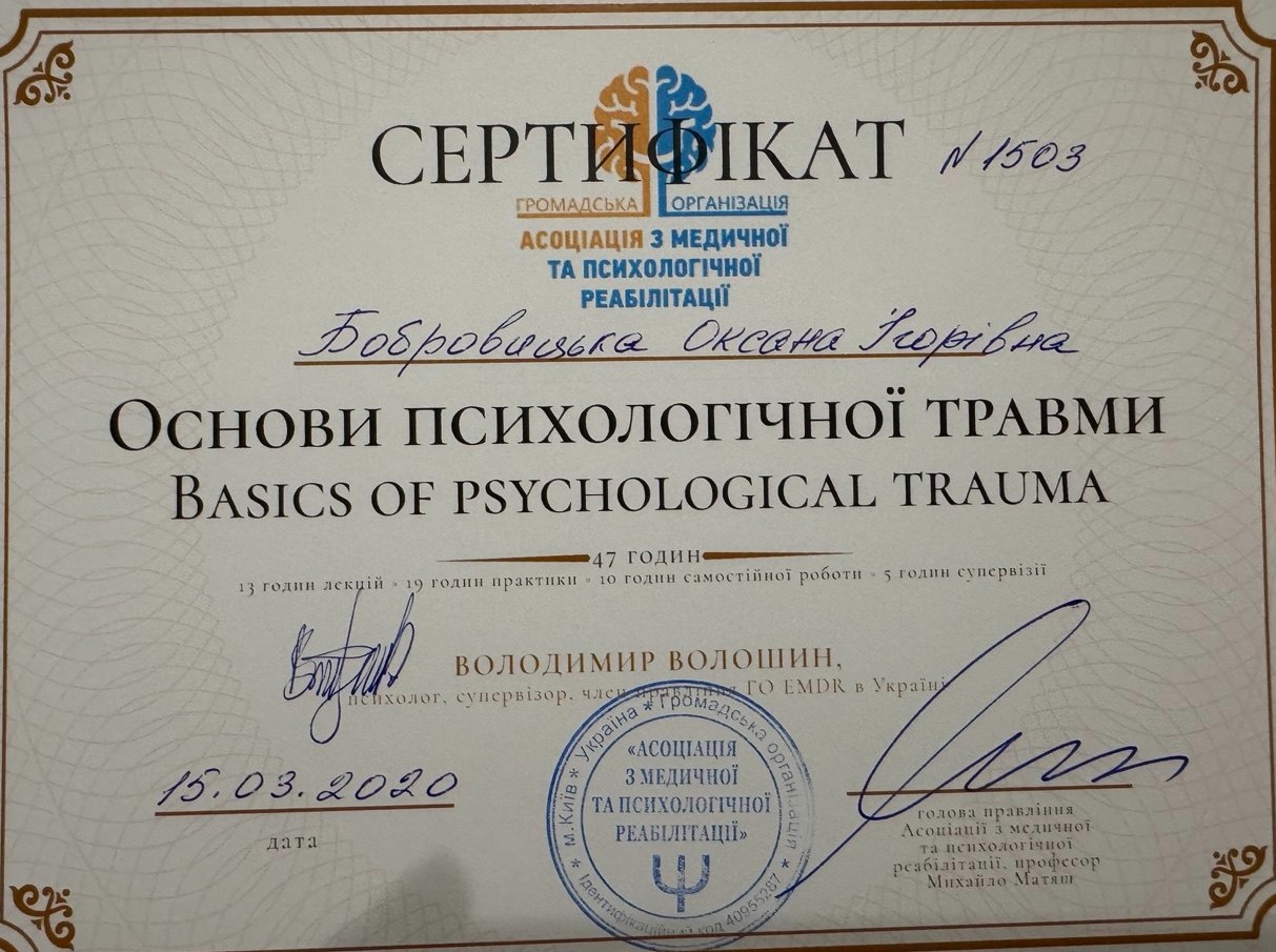 Березень 2020р. проходила навчання з Основ психологічної травми 47 годин, Асоціація з медичної та психологічної реабілітації (сертифікат).