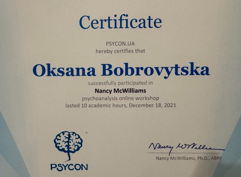 З червня 2024 року і на даний час підвищую кваліфікацію в Київському інституті сучасної психології та психотерапії, курс з групової психоаналітичної психотерапії ("Основи психодинамічної групової психокорекції" та "Методика і техніка групової психодинамічної психотерапії").