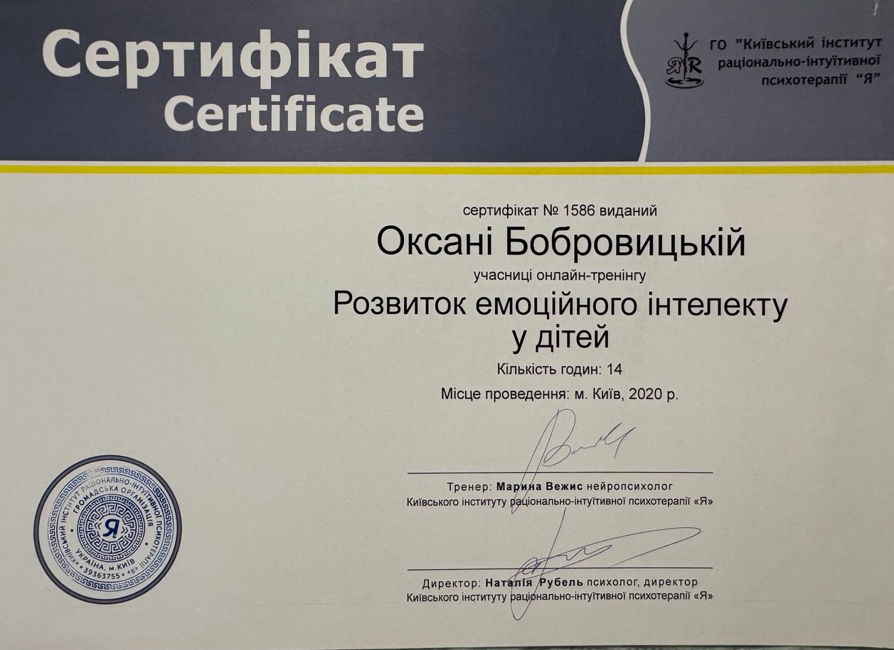 Жовтень 2020р. брала участь в онлайн-тренінгу «Розвиток емоційного інтелекту у дітей» 14 годин, «Київський інститут раціонально-інтуїтивної психотерапії «Я» (сертифікат).