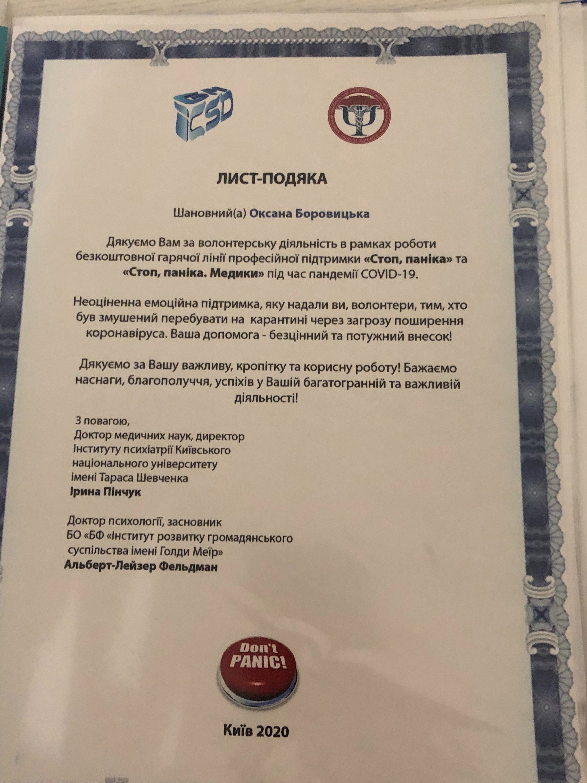 2022 – успішно пройшла тренінг з надання першої кризової психологічної допомоги та самодопомоги (10 годин) Сертифікат