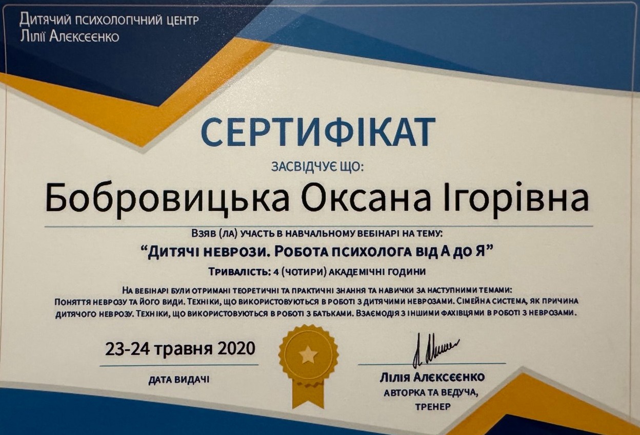 Травень 2020 року брала участь у навчальному вебінарі на тему «Дитячі неврози. Робота психолога від А до Я», 4 години (сертифікат).