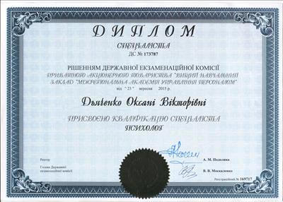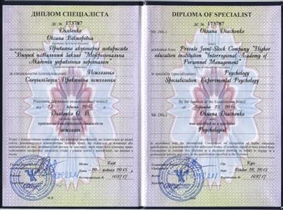 2013р.Приватне акціонерне товариство "Вищий навчальний заклад "Міжрегіональна Академія управління персоналом" - друга вища освіта зі спеціальності "Практична психологія".