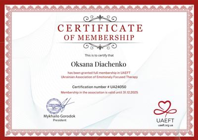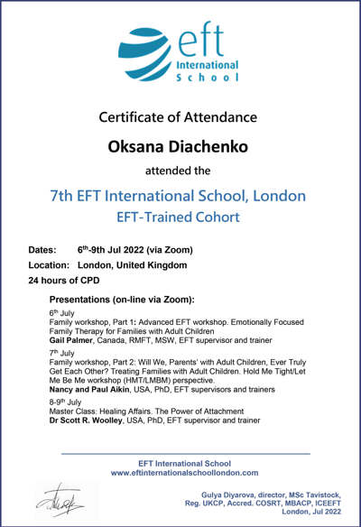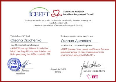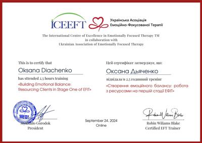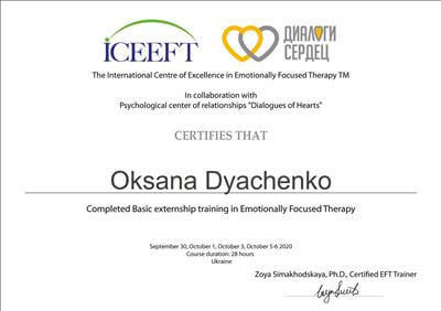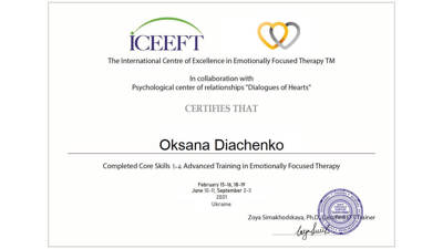 2021. – ICEEFT (Canada) та психологічний центр "Діалоги сердець". Курс з Емоційно Фокусованої Індивідуальної Терапії (ЕФІТ)