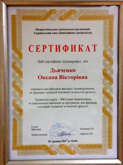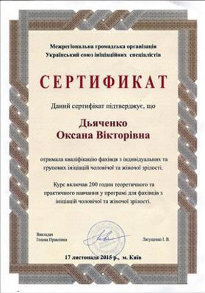2017 р. - Спілка Ініціаційних спеціалістів України. Навчаючий фахівець за ініціацій чоловічої та жіночої зрілості (400 годин навчання).