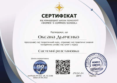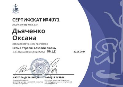2024. -2024. - "Київський Інститут Раціонально-інтуітивної психотерапії Я". Навчальний курс зі Схематерапії.