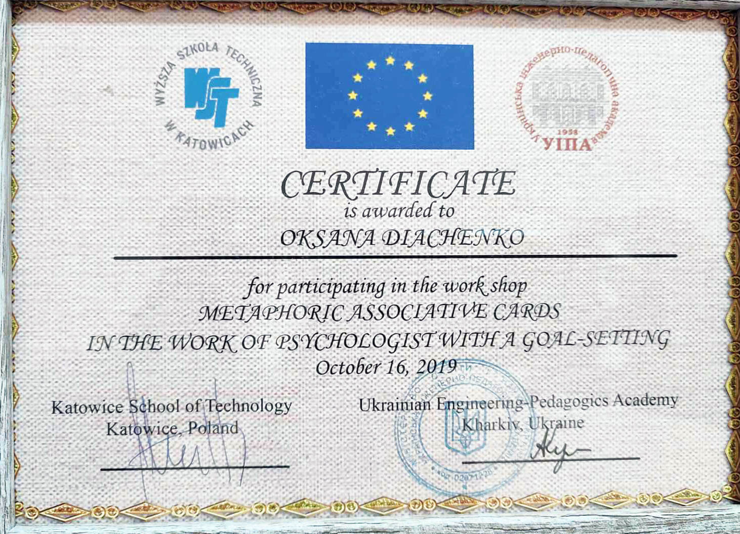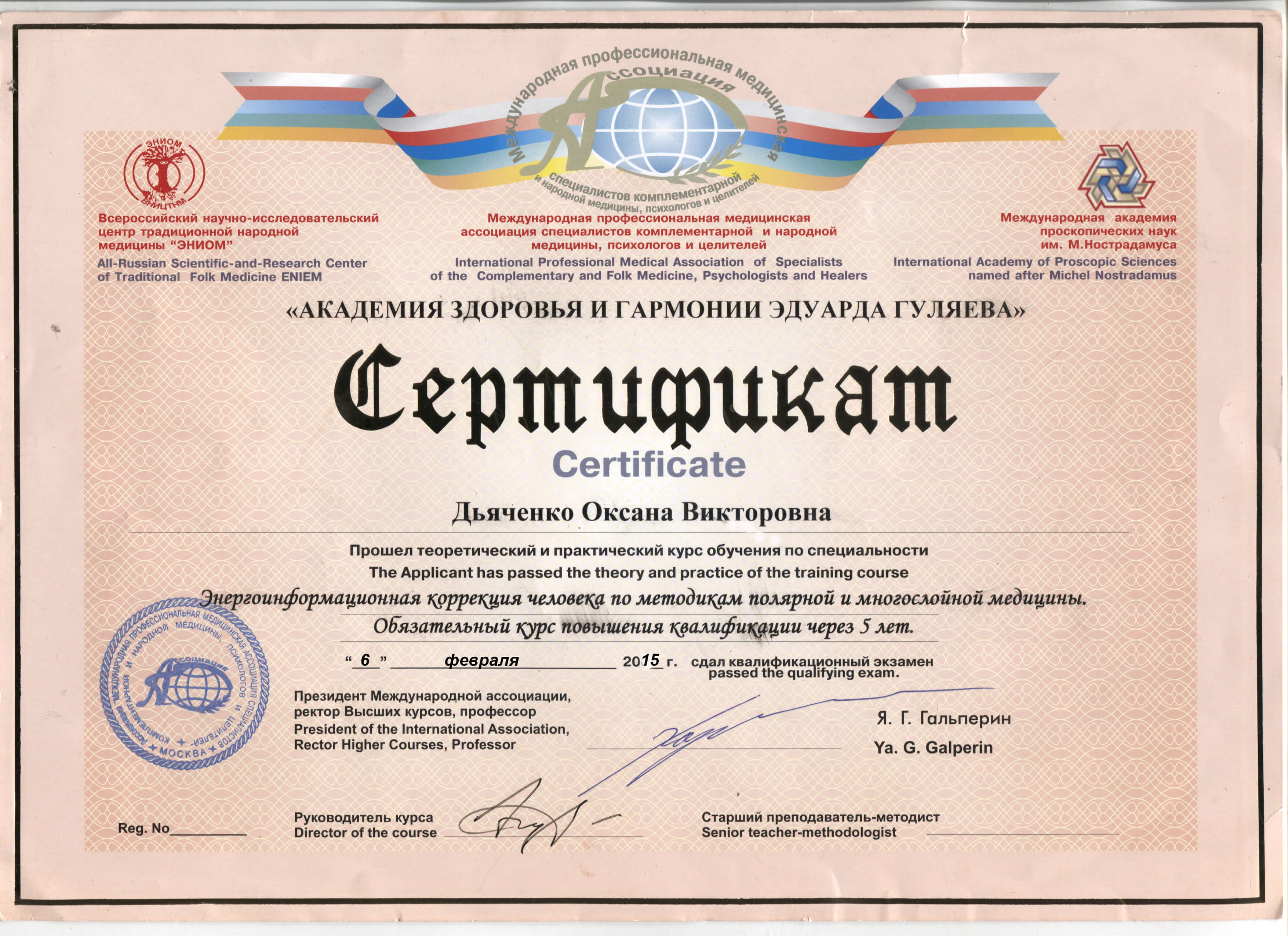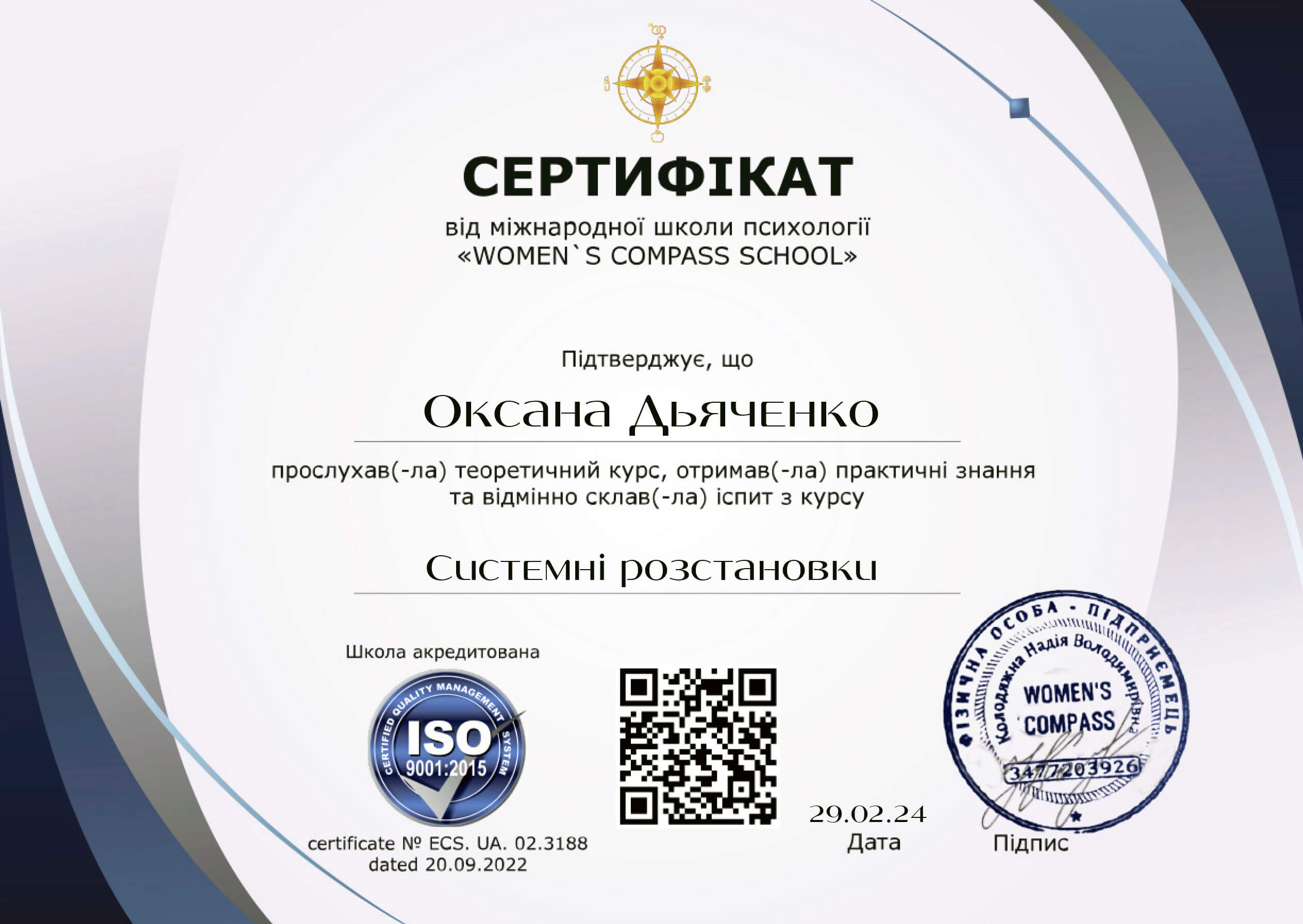 2017 р. - Спілка Ініціаційних спеціалістів України. Навчаючий фахівець за ініціацій чоловічої та жіночої зрілості (400 годин навчання).