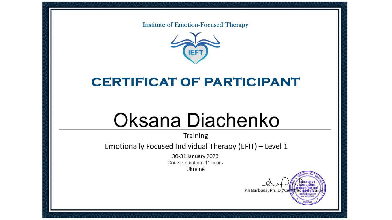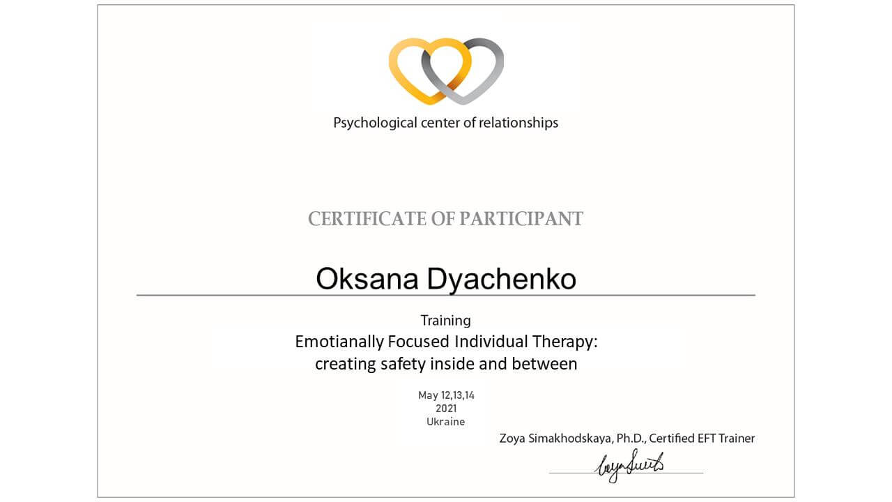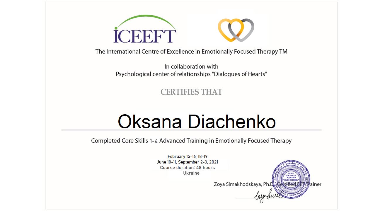 2021. – ICEEFT (Canada) та психологічний центр "Діалоги сердець". Курс з Емоційно Фокусованої Індивідуальної Терапії (ЕФІТ)
