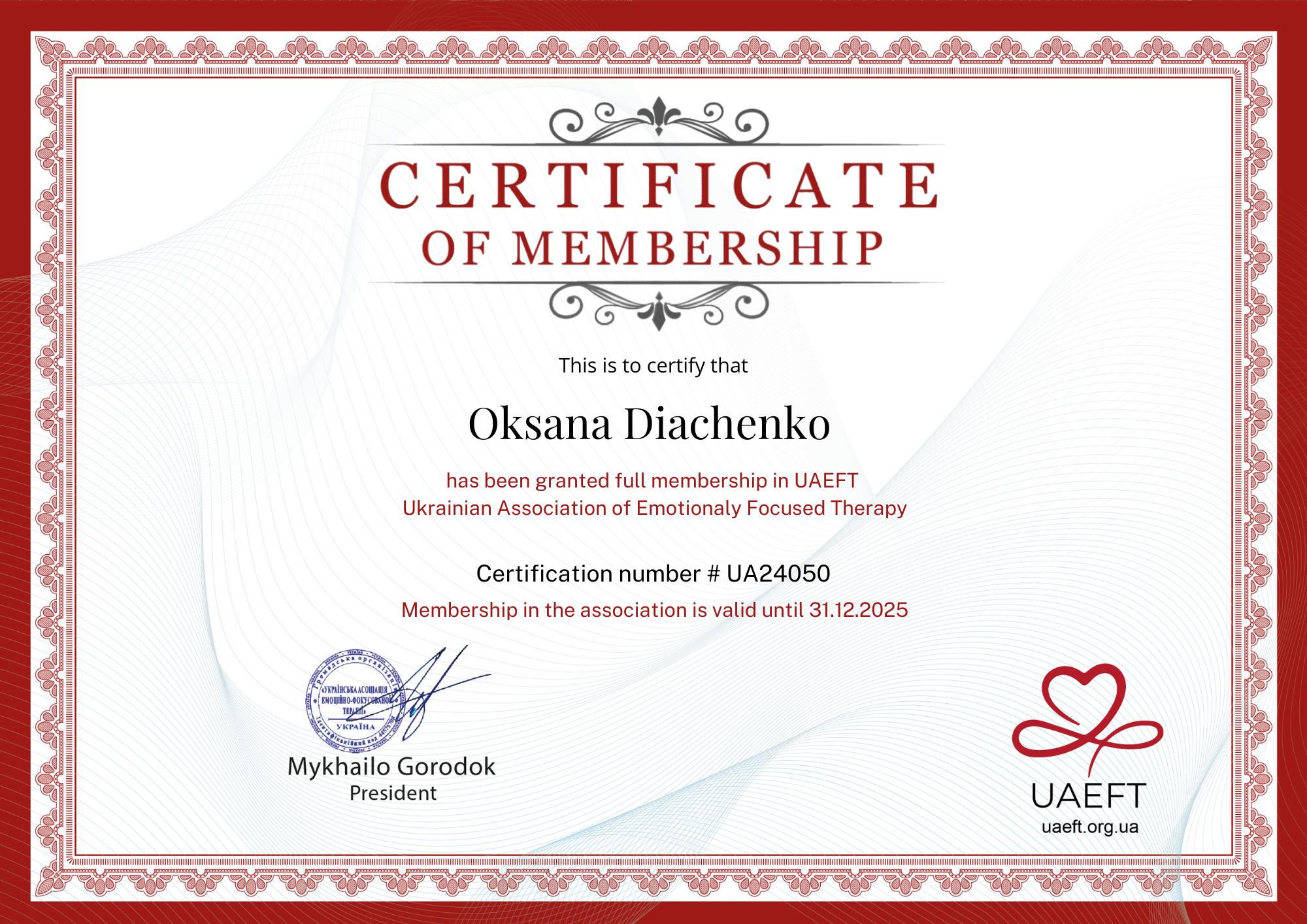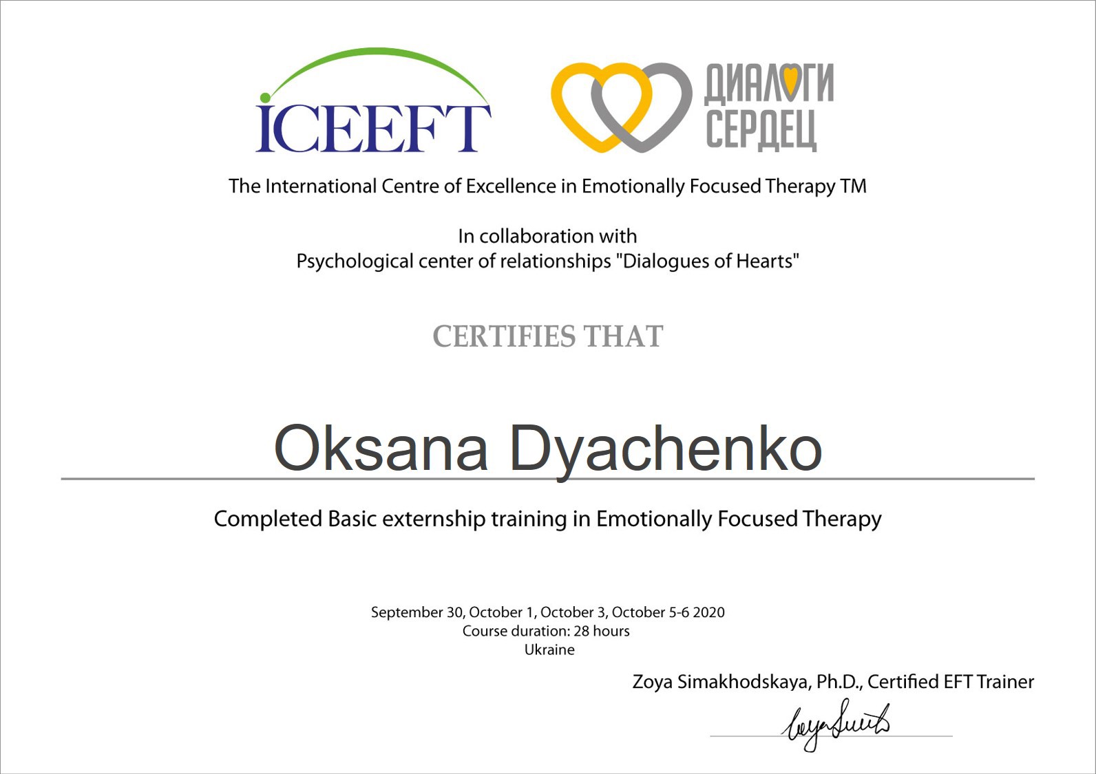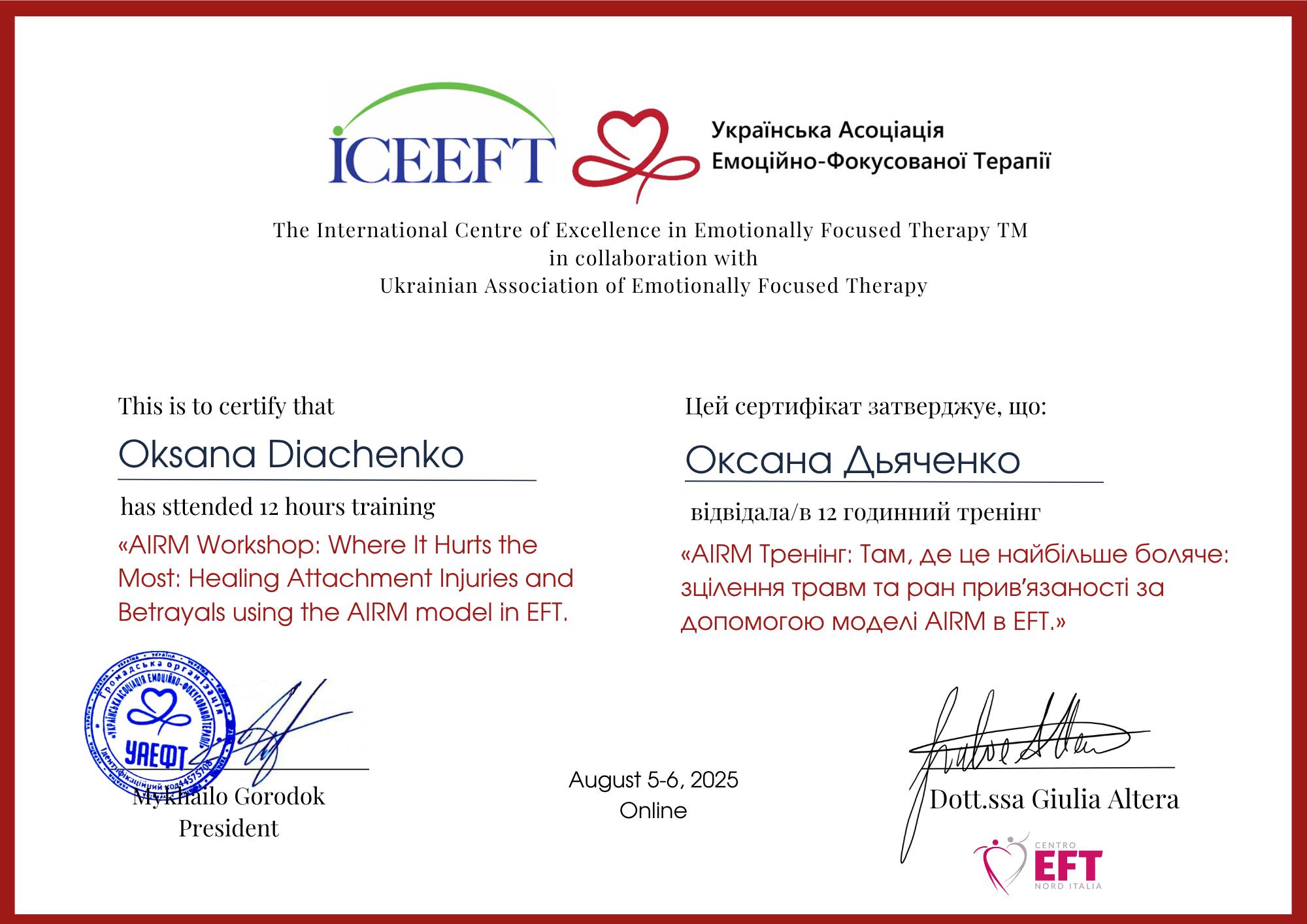 2021. – ICEEFT (Canada) та психологічний центр "Діалоги сердець". Курс з Емоційно Фокусованої Індивідуальної Терапії (ЕФІТ)