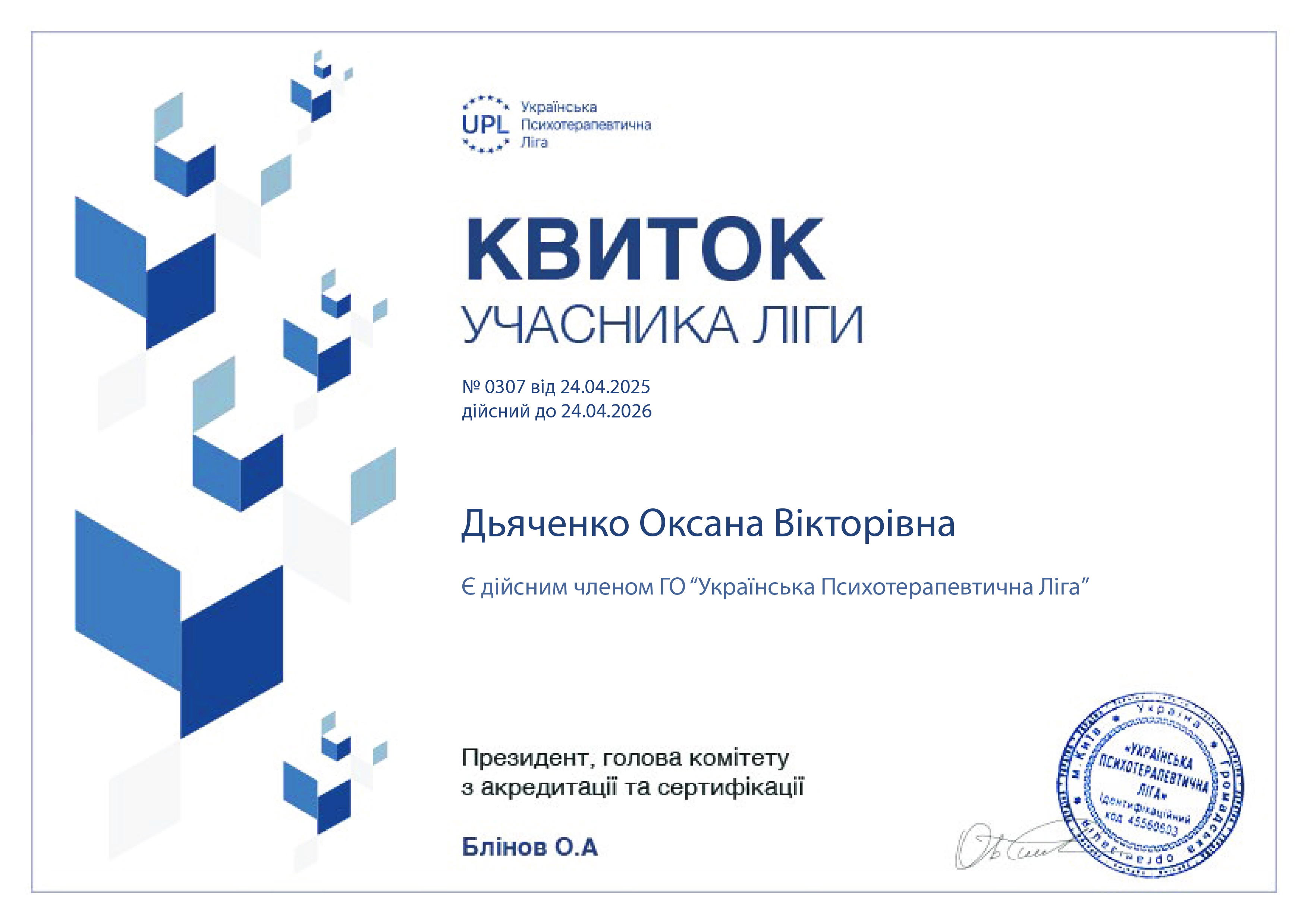 2017 р. - Спілка Ініціаційних спеціалістів України. Навчаючий фахівець за ініціацій чоловічої та жфночої зрілості (400 годин навчання).