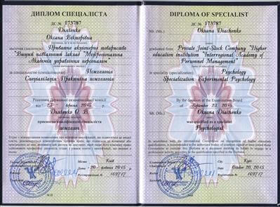 2013р.Приватне акціонерне товариство "Вищий навчальний заклад "Міжрегіональна Академія управління персоналом" - друга вища освіта зі спеціальності "Практична психологія".