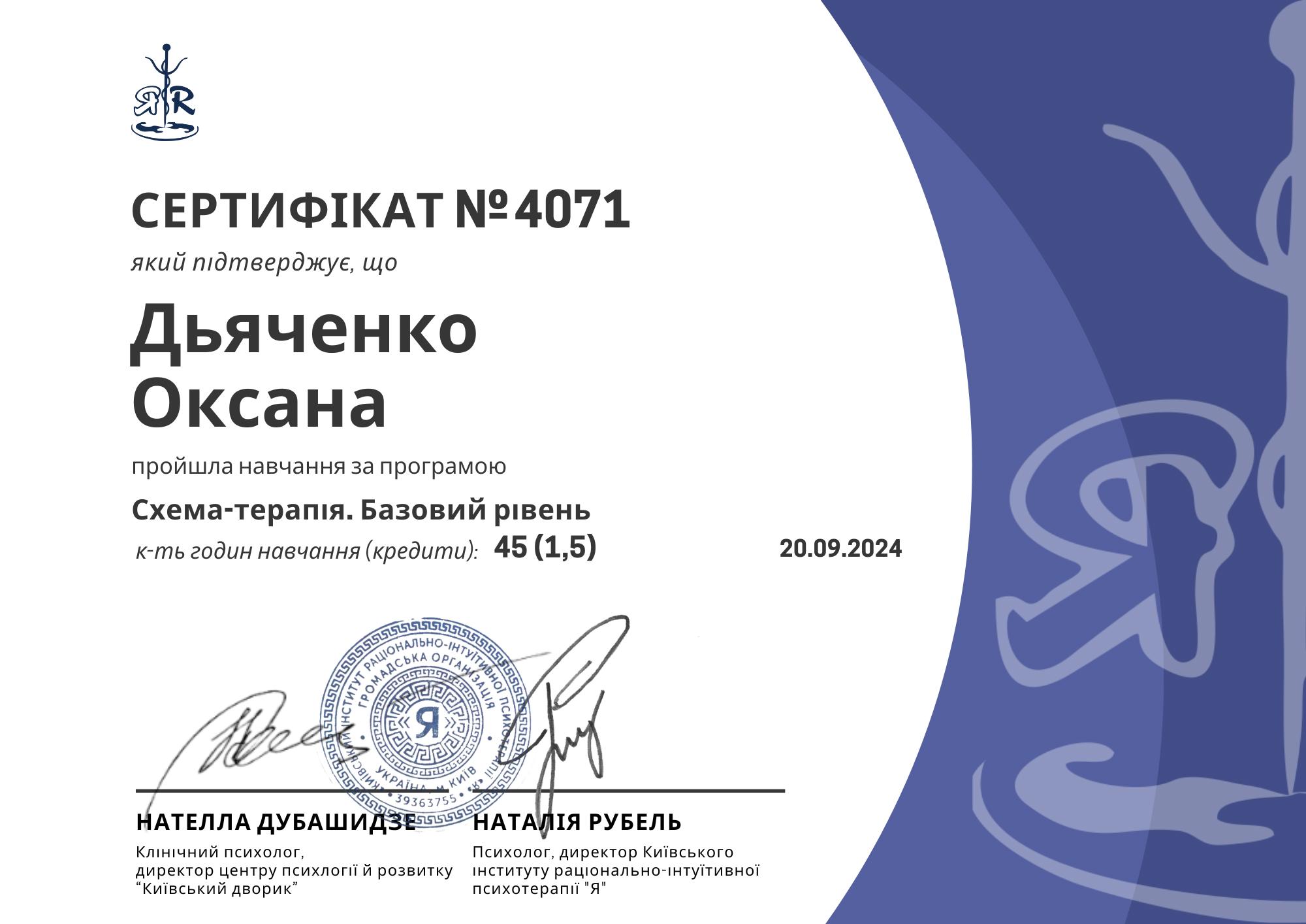 2024. -2024. - "Київський Інститут Раціонально-інтуітивної психотерапії Я". Навчальний курс зі Схематерапії.