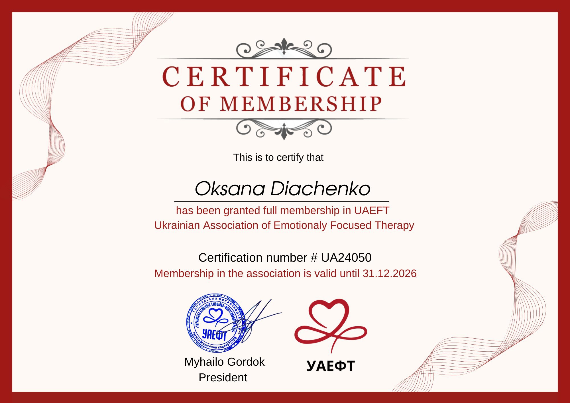 До цього дня я навчаюсь та освоюю нові методи роботи. Іноді беру прийоми для продовження особистої терапії та супервізуюсь у своєму улюбленому методі – Емоційно Фокусована Терапія. Є чинним членом Української Асоціації ЕФТ.