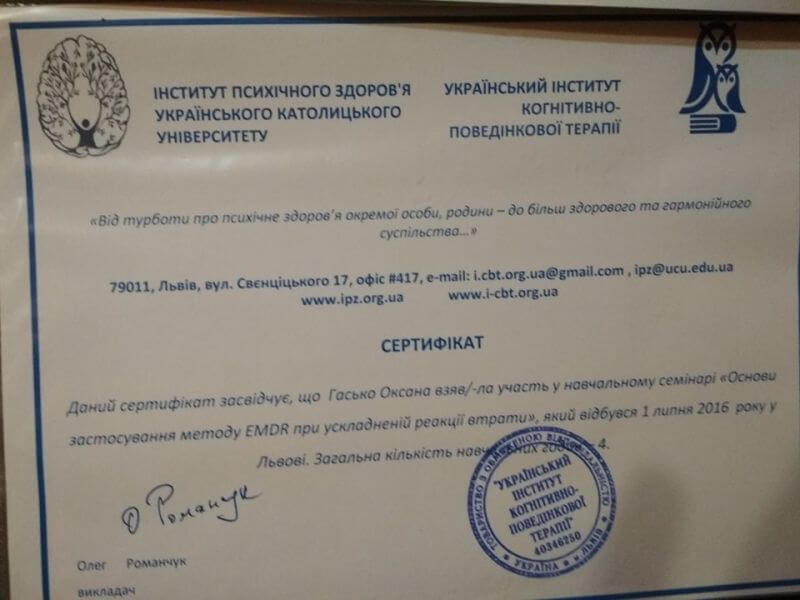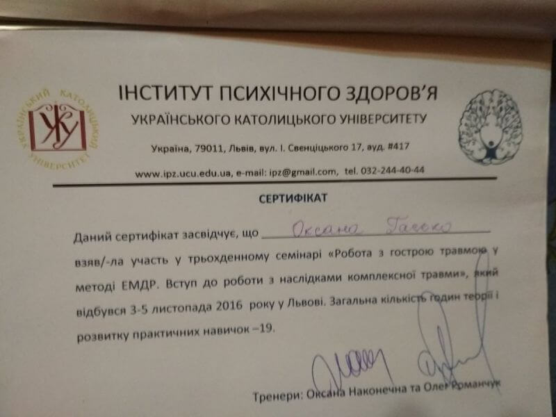курси підвищення кваліфікації за 144-годинною навчальною програмою для практичних психологів загальноосвітніх навчальних закладів при Українському науково-методичному центрі практичної психології і соціальної роботи за модулем "Використання арт-терапії в роботі практичного психолога та соціального педагога"