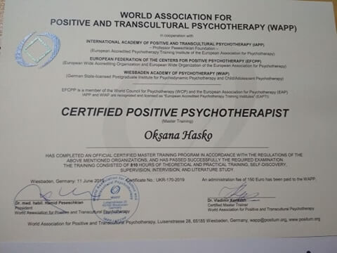 Всесвітня асоціація позитивної та транскультуральної психотерапії (WAPP), Українська асоціація позитивної психотерапії (УАПП), Український інститут позитивної крос-культурної психотерапії і менеджменту (УІПП)