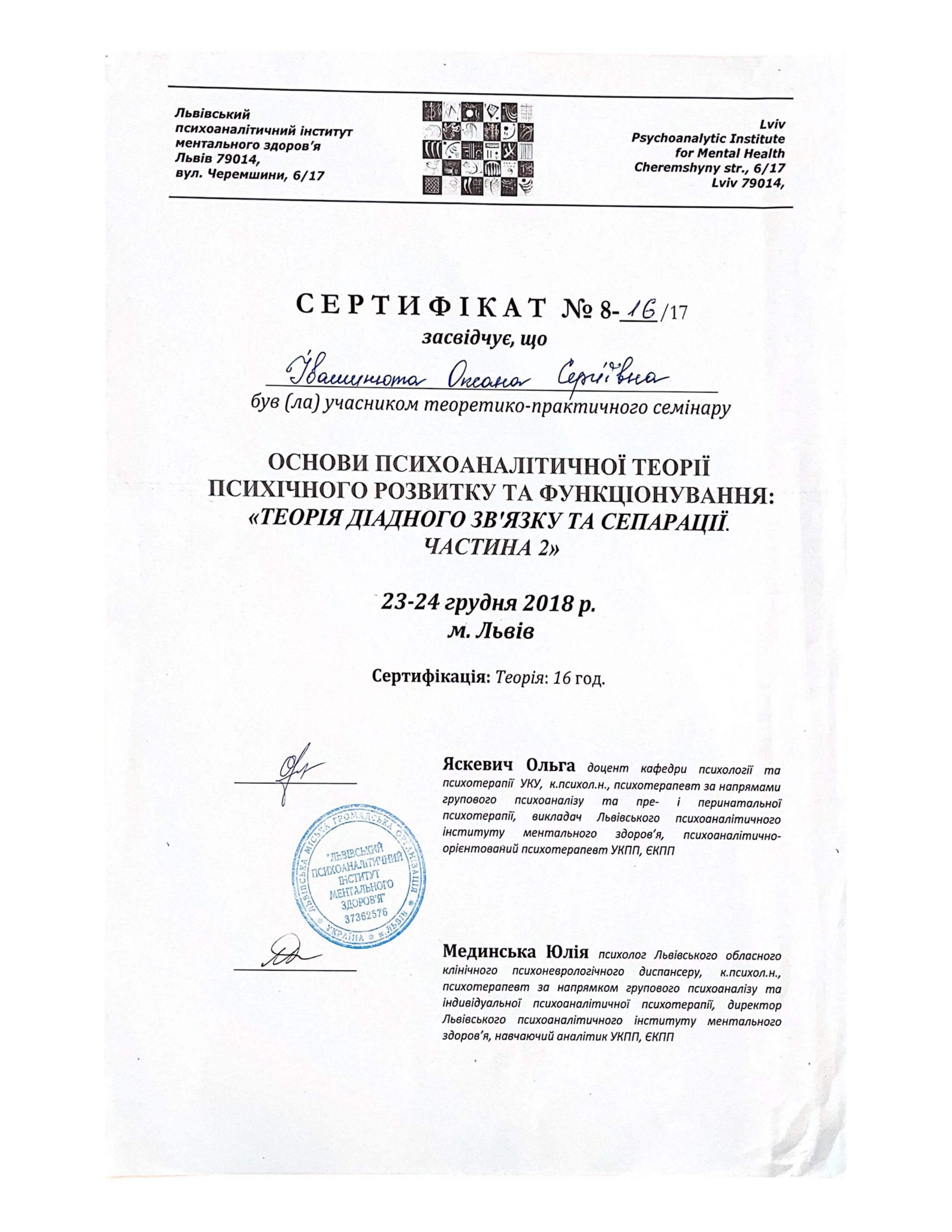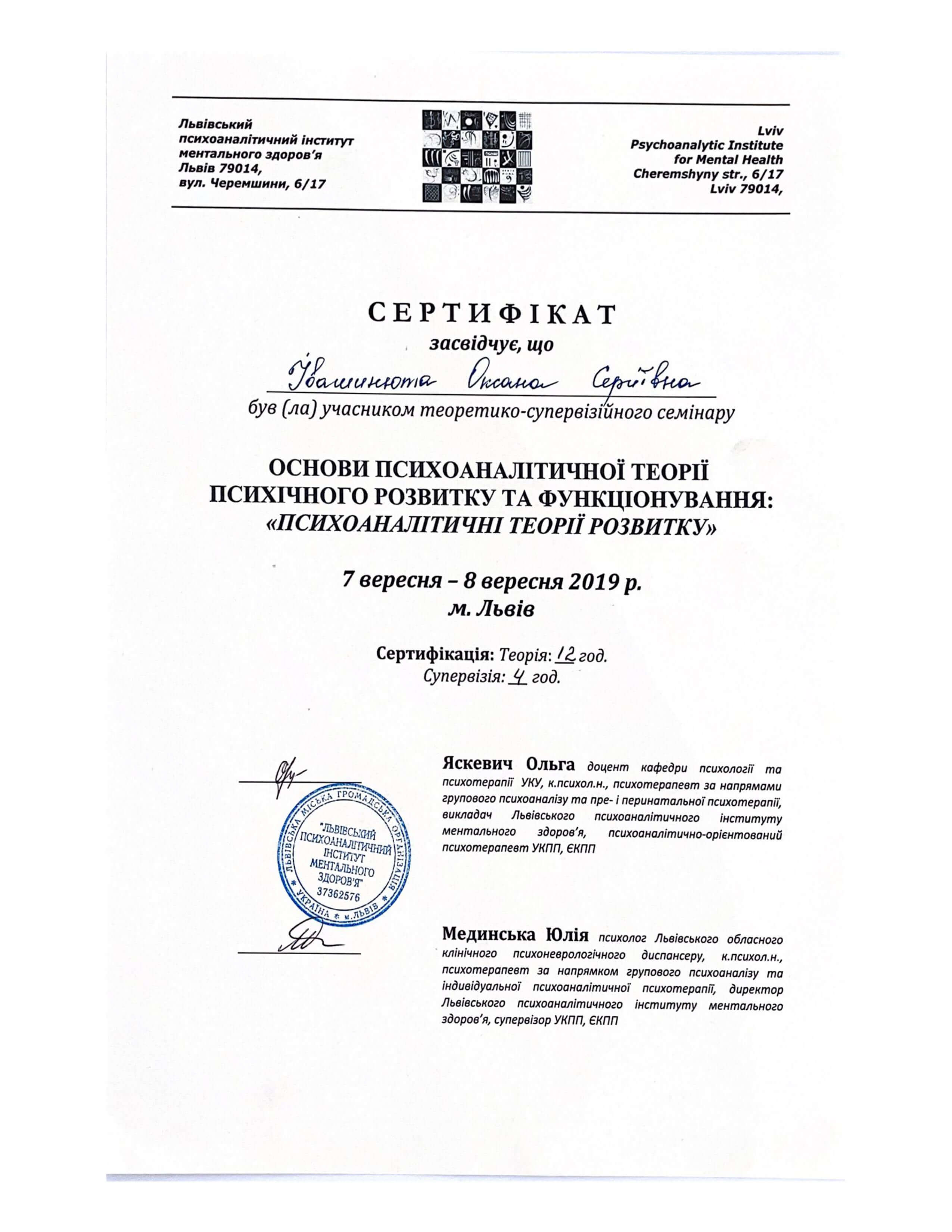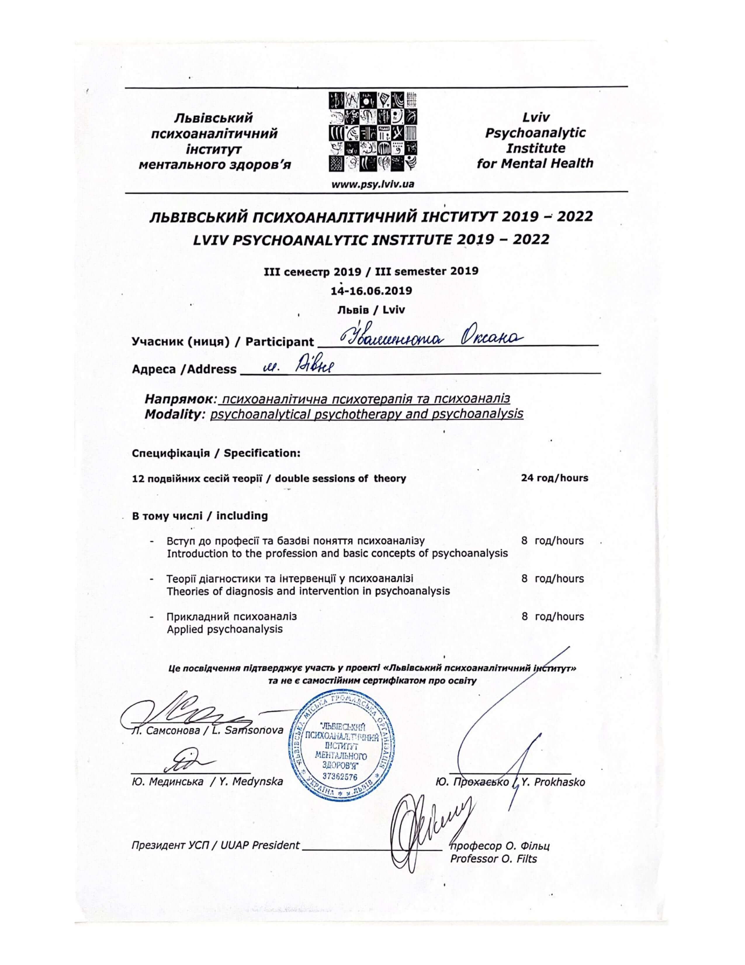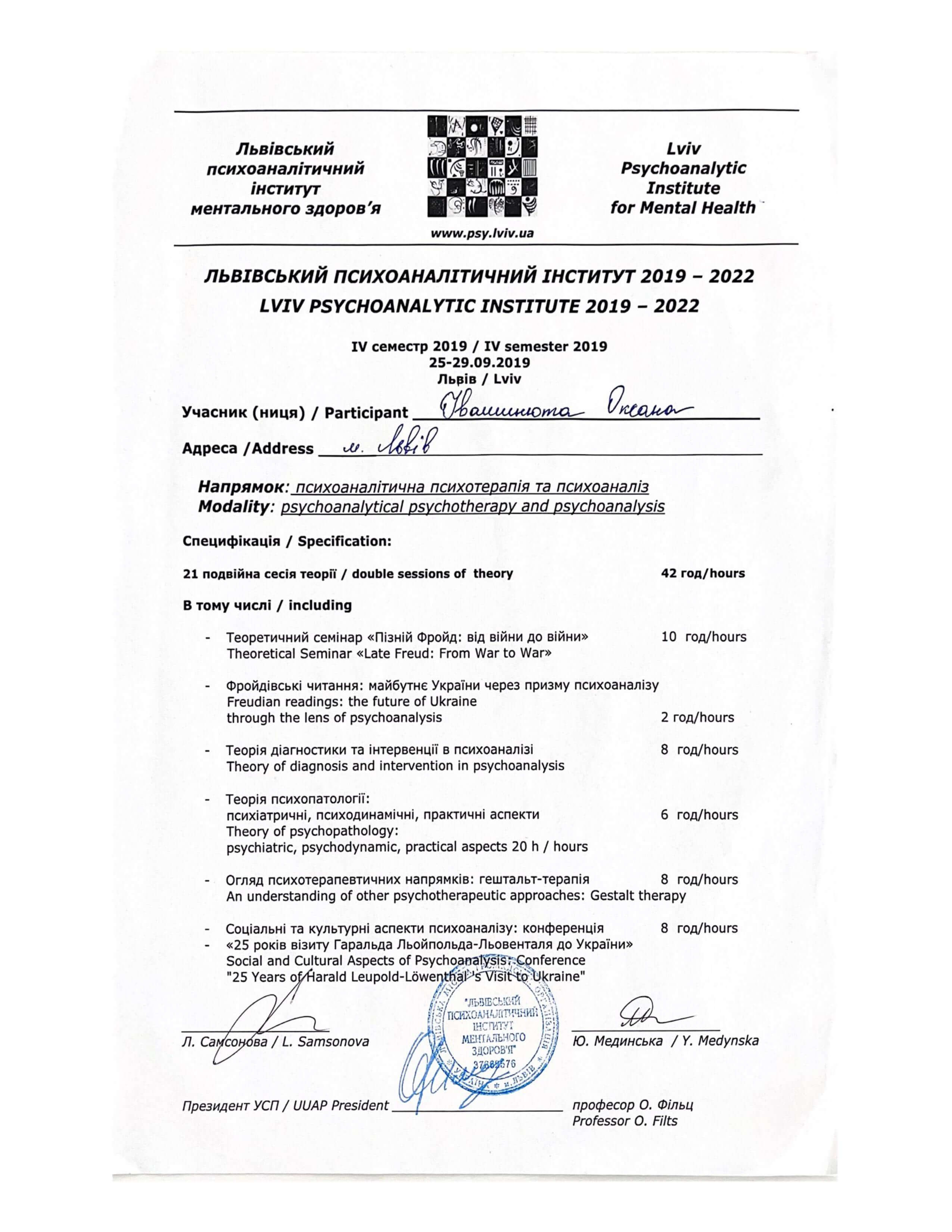 В 2023р. закінчила Львівський психоаналітичний інститут ментального здоров'я. Вивчаю груповий психоаналіз у Трускавецької школі психотерапії. Була учасницею теоретико-супервізійних семінарів з основ психоаналітичної теорії, психічного розвитку та функціонування: "Психоаналітичні теорії розвитку", "Теорія діадного зв'язку та сепарації", теоретико-супервізійного семінару "Травма та репарація: теоретичні та практичні підходи , "Клінічний нейропсихоаналіз: історія розвитку, досягнення" провідна Karen Kaplan-Solms, "Бордерляйн та міжові стани. Виникнення, проявлення та діагностика, підходи до терапії", "Залежності та психотерапія залежностей. супервізійний проект "Психоаналіз:від теорії до практики" -керівник проекту Ніколова О. М., "Робота з дітьми у ситуації розлучення" Пройшла пропедевтику з психіатрії "Тривожні, невротичні та пов'язані зі стресом розладу". Брала участь у вебінарах з міжнародною участю "Нові горизонти у лікуванні шизофренії". Була учасницею Науково-практичних конференцій з міжнародною участю з "Основ психотерапії"