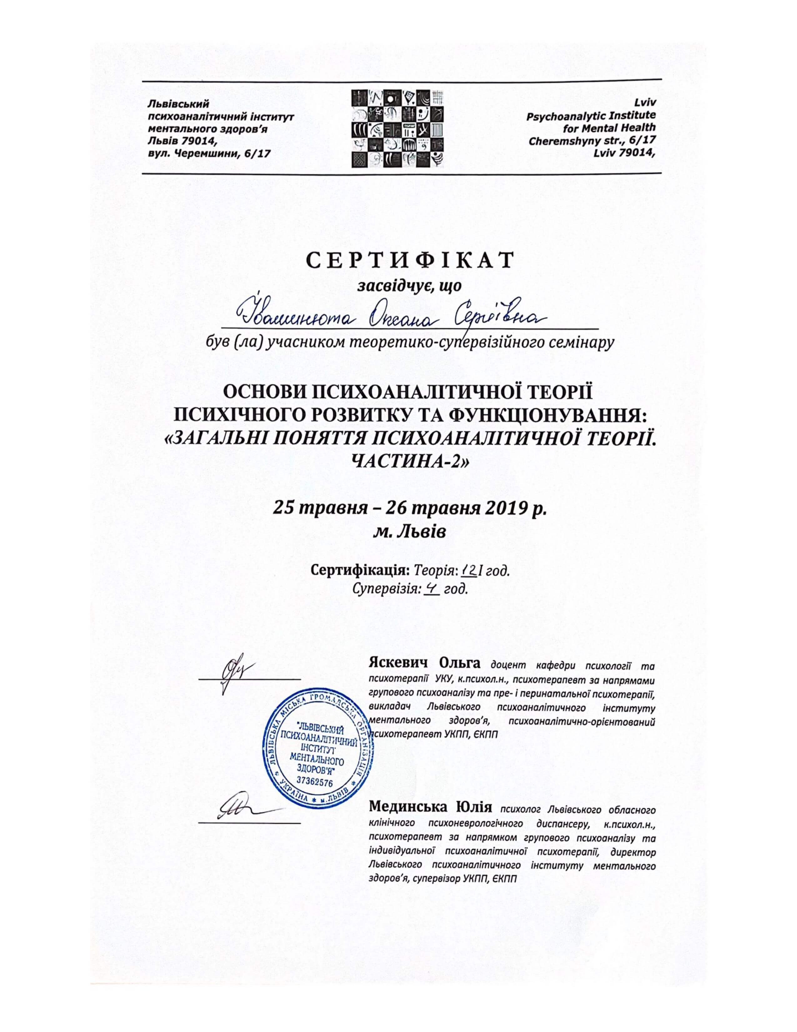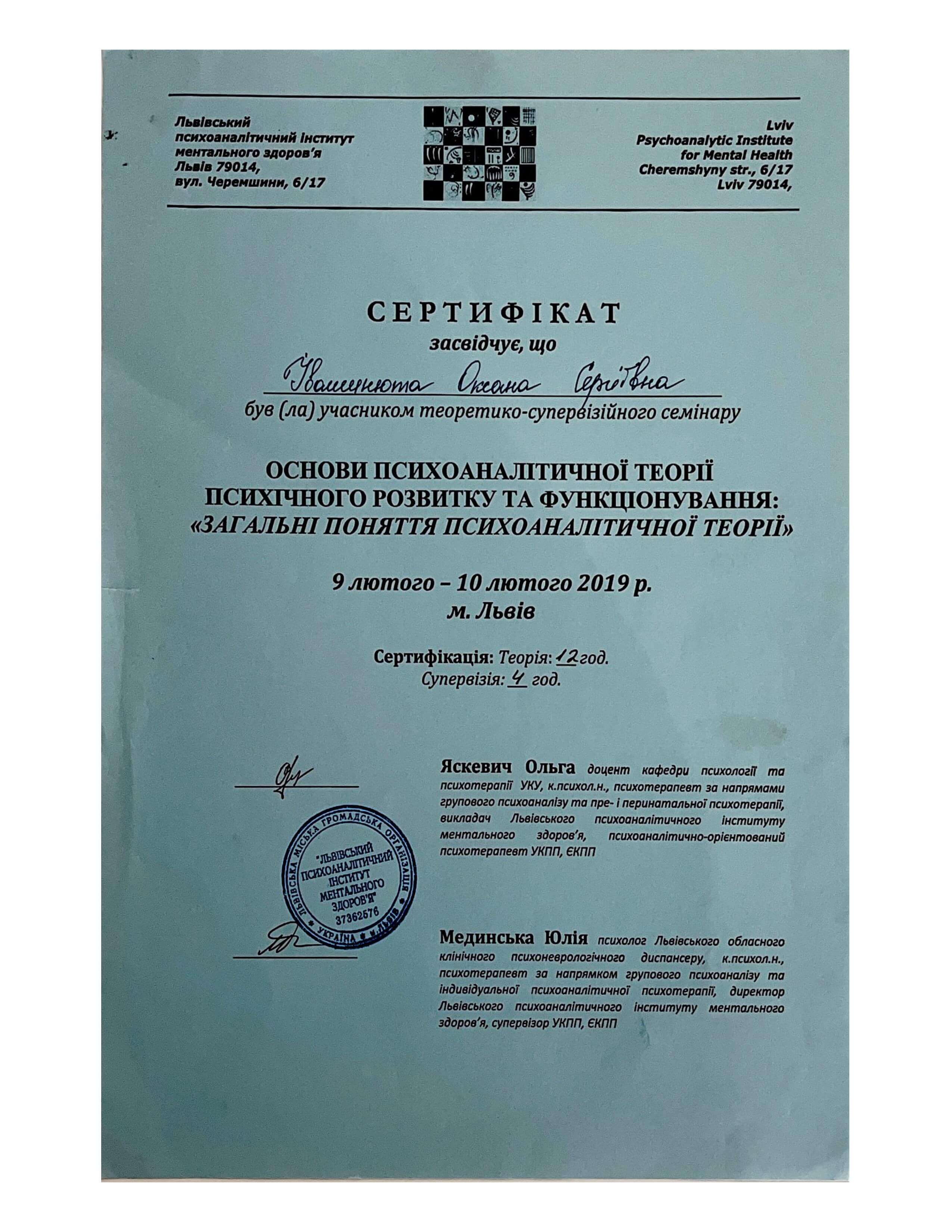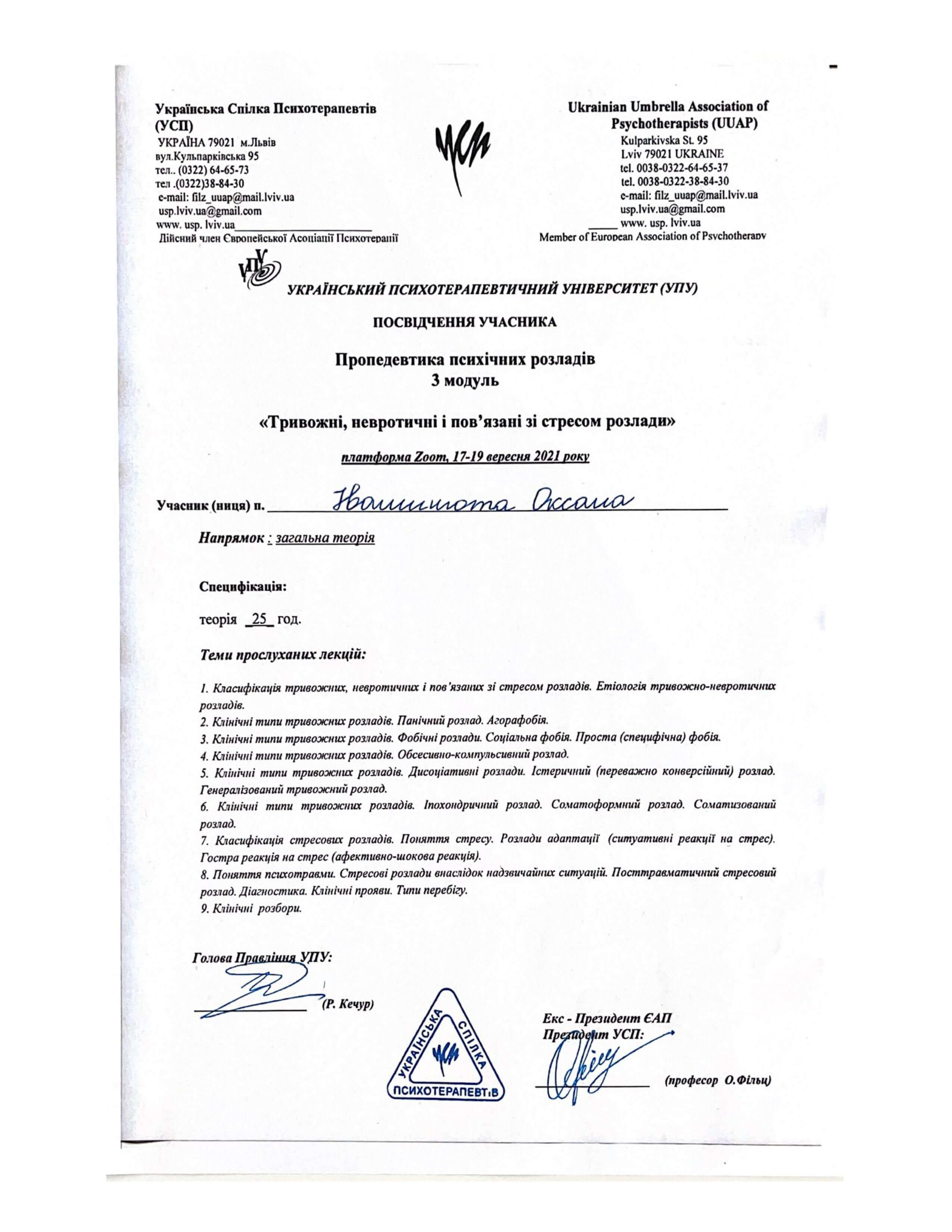 В 2023р. закінчила Львівський психоаналітичний інститут ментального здоров'я. Вивчаю груповий психоаналіз у Трускавецької школі психотерапії. Була учасницею теоретико-супервізійних семінарів з основ психоаналітичної теорії, психічного розвитку та функціонування: "Психоаналітичні теорії розвитку", "Теорія діадного зв'язку та сепарації", теоретико-супервізійного семінару "Травма та репарація: теоретичні та практичні підходи , "Клінічний нейропсихоаналіз: історія розвитку, досягнення" провідна Karen Kaplan-Solms, "Бордерляйн та міжові стани. Виникнення, проявлення та діагностика, підходи до терапії", "Залежності та психотерапія залежностей. супервізійний проект "Психоаналіз:від теорії до практики" -керівник проекту Ніколова О. М., "Робота з дітьми у ситуації розлучення" Пройшла пропедевтику з психіатрії "Тривожні, невротичні та пов'язані зі стресом розладу". Брала участь у вебінарах з міжнародною участю "Нові горизонти у лікуванні шизофренії". Була учасницею Науково-практичних конференцій з міжнародною участю з "Основ психотерапії"