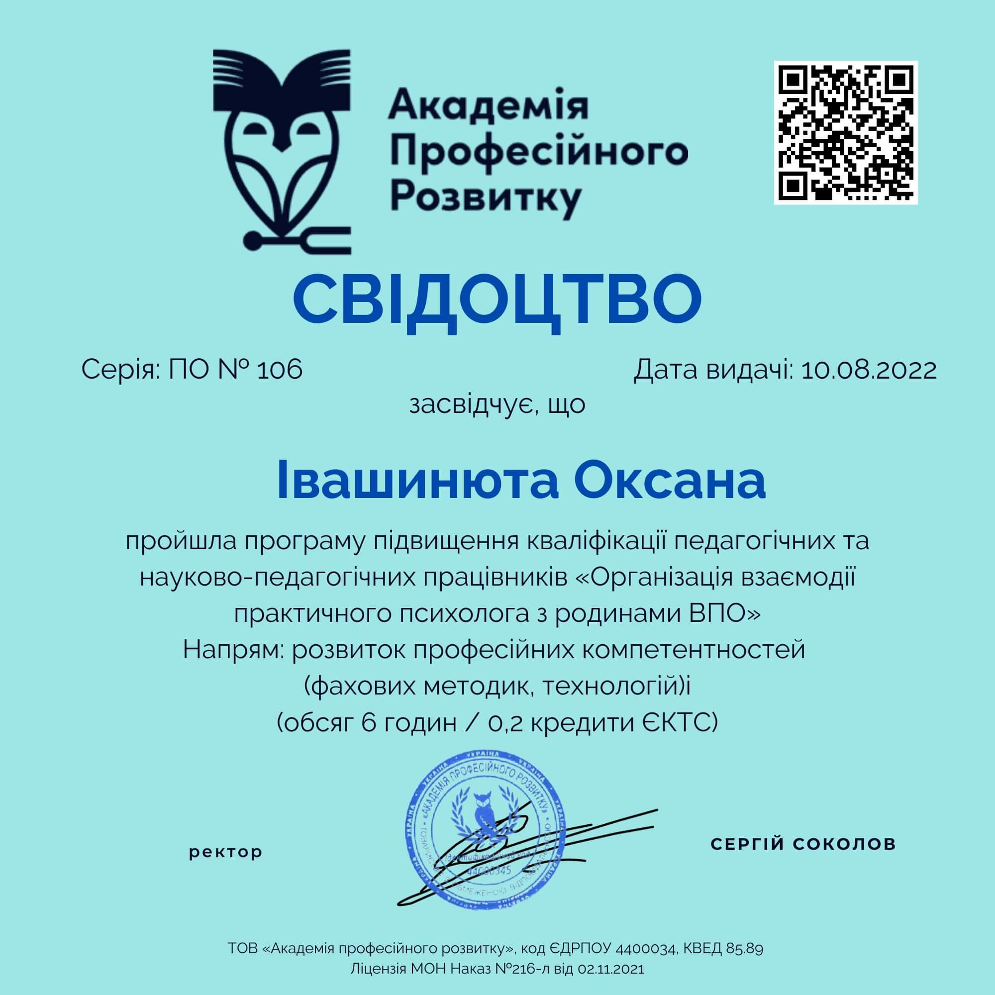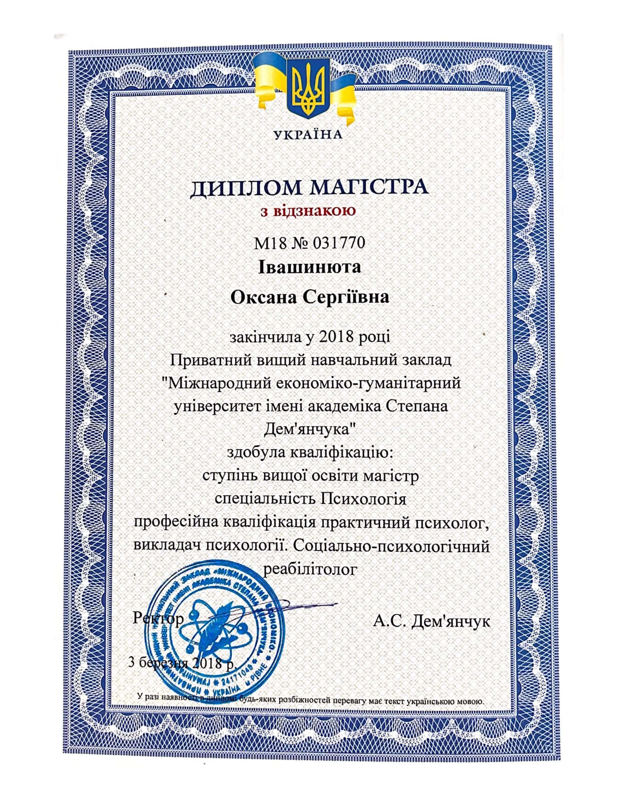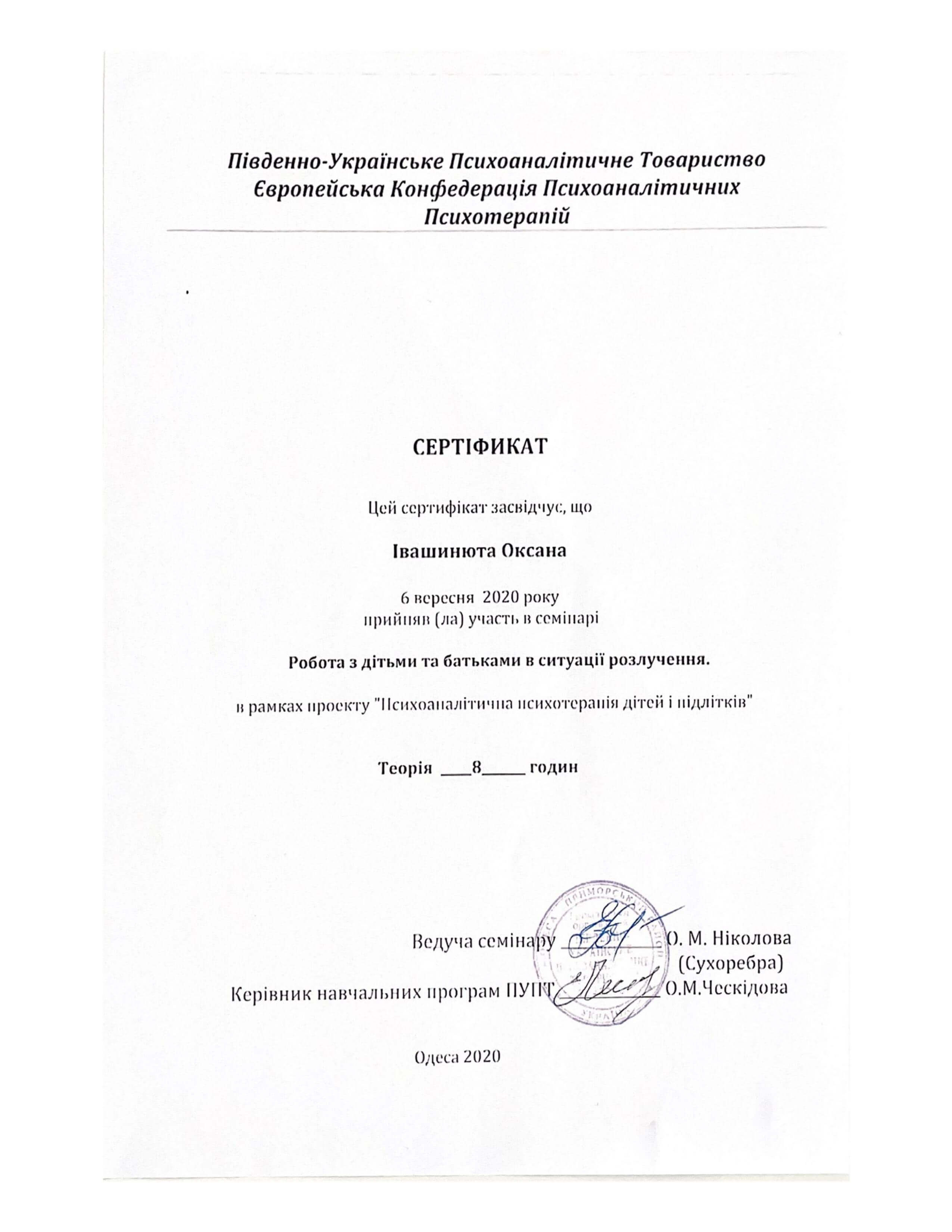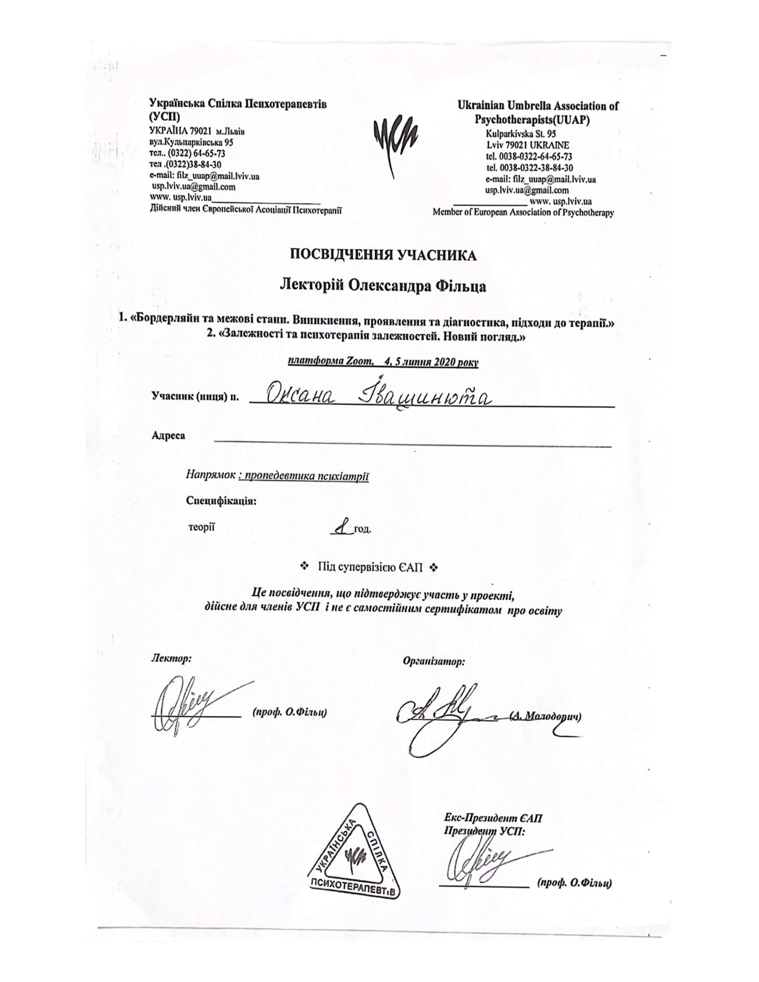 В 2023р. закінчила Львівський психоаналітичний інститут ментального здоров'я. Вивчаю груповий психоаналіз у Трускавецької школі психотерапії. Була учасницею теоретико-супервізійних семінарів з основ психоаналітичної теорії, психічного розвитку та функціонування: "Психоаналітичні теорії розвитку", "Теорія діадного зв'язку та сепарації", теоретико-супервізійного семінару "Травма та репарація: теоретичні та практичні підходи , "Клінічний нейропсихоаналіз: історія розвитку, досягнення" провідна Karen Kaplan-Solms, "Бордерляйн та міжові стани. Виникнення, проявлення та діагностика, підходи до терапії", "Залежності та психотерапія залежностей. супервізійний проект "Психоаналіз:від теорії до практики" -керівник проекту Ніколова О. М., "Робота з дітьми у ситуації розлучення" Пройшла пропедевтику з психіатрії "Тривожні, невротичні та пов'язані зі стресом розладу". Брала участь у вебінарах з міжнародною участю "Нові горизонти у лікуванні шизофренії". Була учасницею Науково-практичних конференцій з міжнародною участю з "Основ психотерапії"