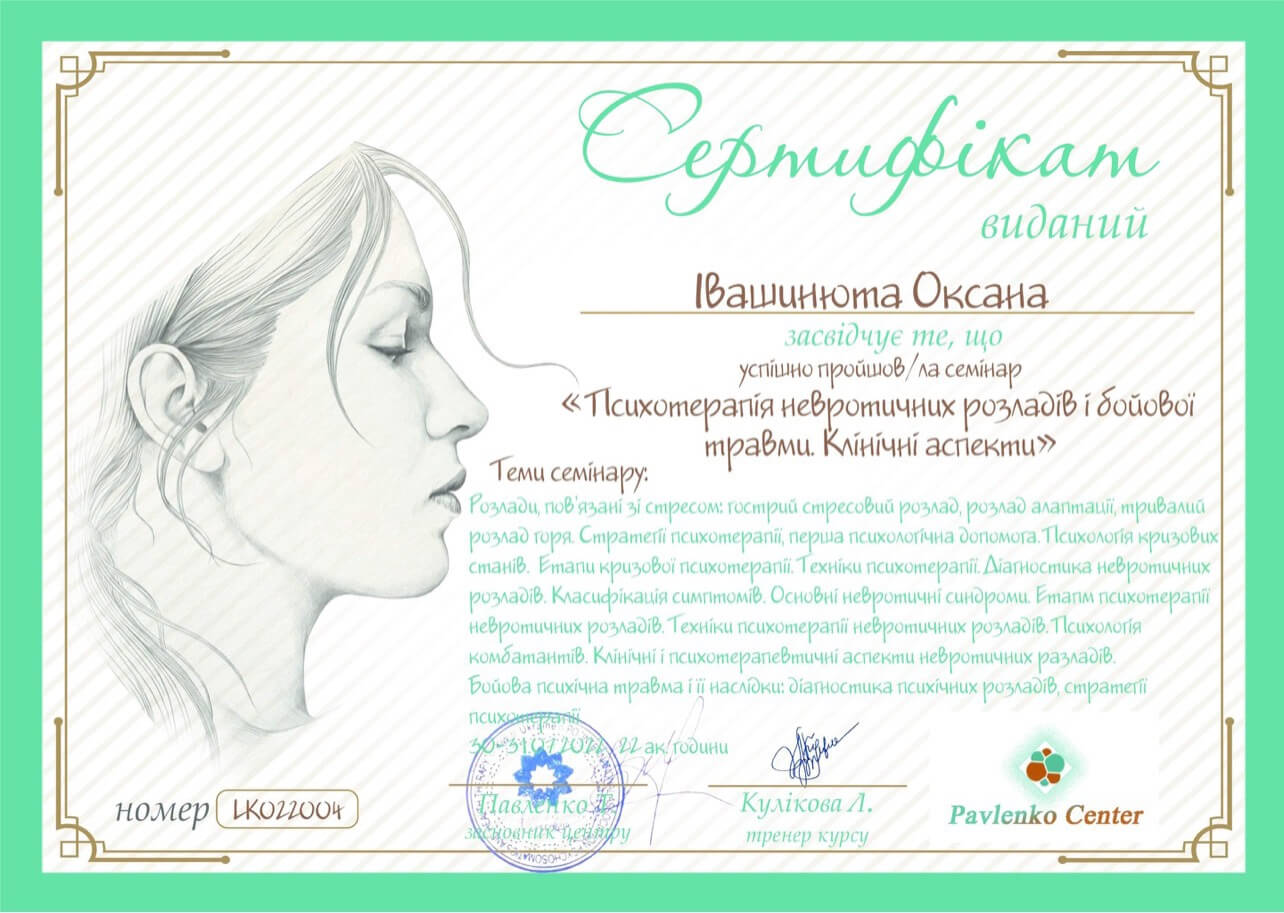 Добре працює із запитами власної цінності, пригнічених станів та внутрішніх конфліктів. Оксана як людина, добра та чуйна. Як психолог - фахівець у психоаналітично орієнтованій психотерапії, яка постійно підвищує свій рівень кваліфікації. .