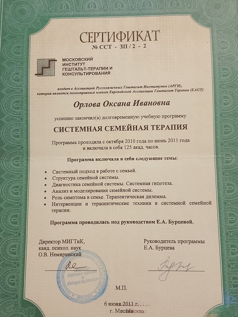 2006-2007рр- 1 ступінь - "Введення в гештальт-терапію" у Київському Гештальт Університеті.
