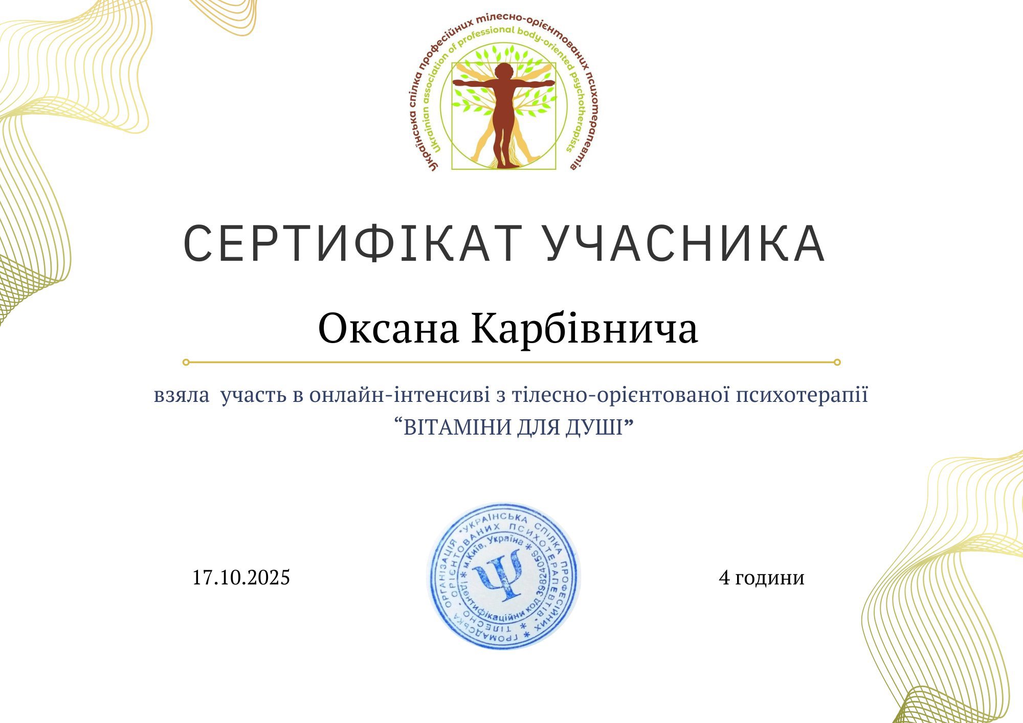 2025р- Спеціалізації «Робота з травмами у Гештальт-підході» в КГУ. (189 годин)