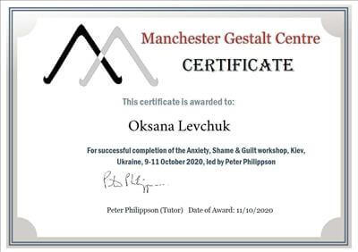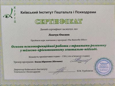 - "Спеціалізація з основ психокорекційної роботи з травмами розвитку у тілесно-орієнтованому гештальт-підході", тренер Олена Кістаєва, КІГіП