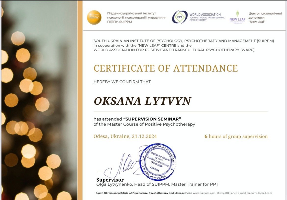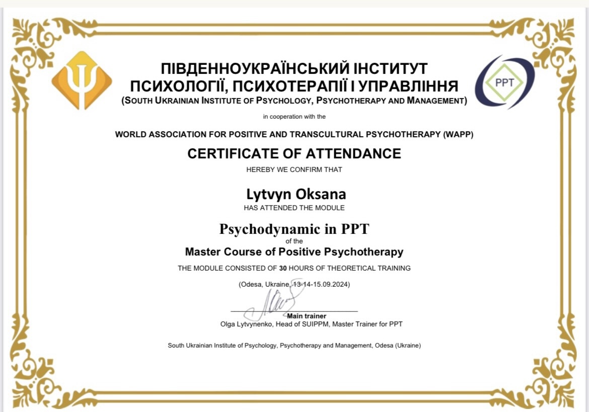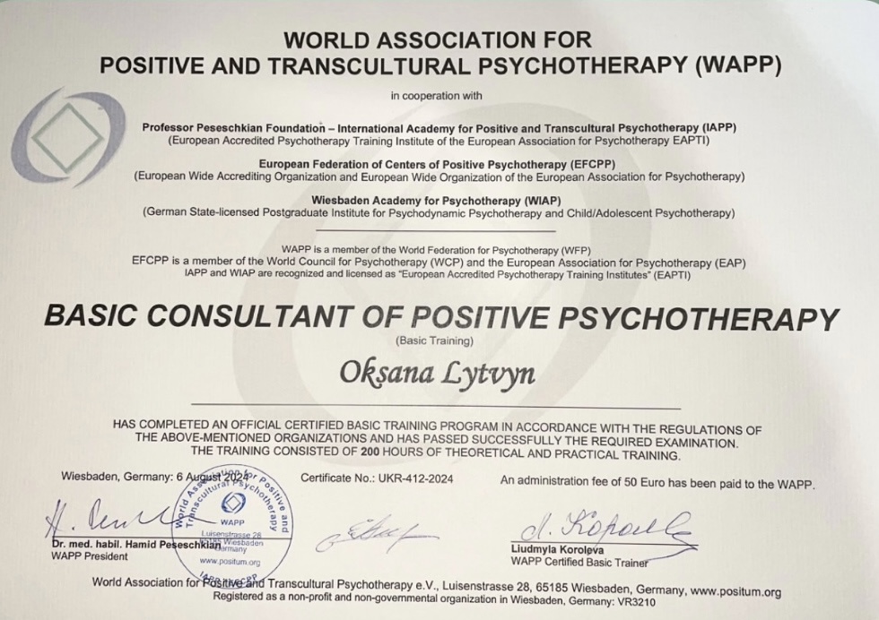 2023–2024 – Базовий консультант у методі Позитивної психодинамічної психотерапії Н. Пезешкіана (Всесвітня асоціація Позитивної психодинамічної психотерапії)
