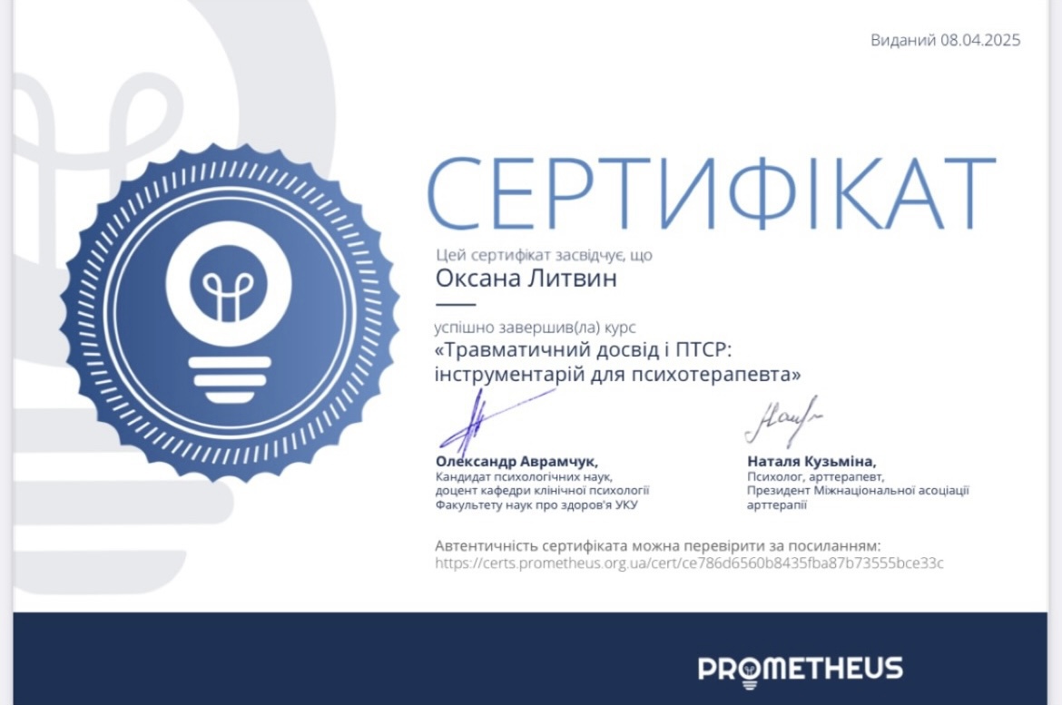 2025 – Травматичний досвід і ПТСР: інструментарій для психотерапевта (Платформа професійного розвитку «Прометеус»)