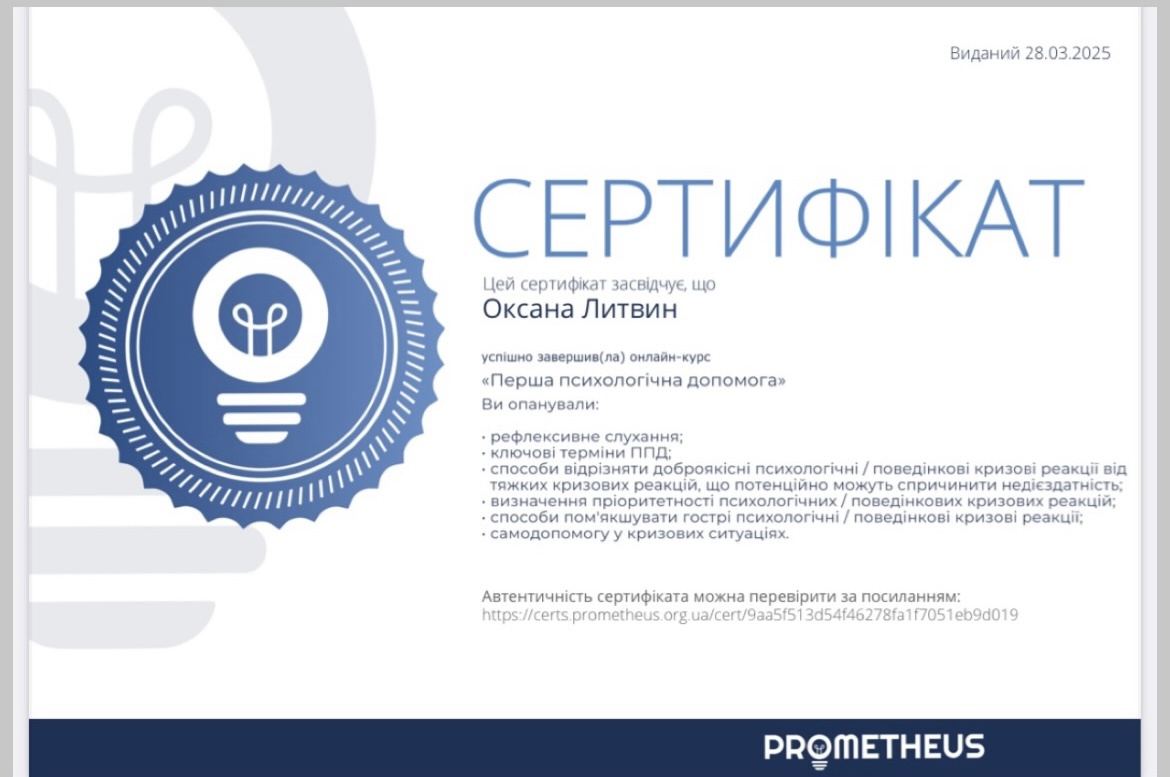 2025 – Перша психологічна допомога (Платформа професійного розвитку «Прометеус»)