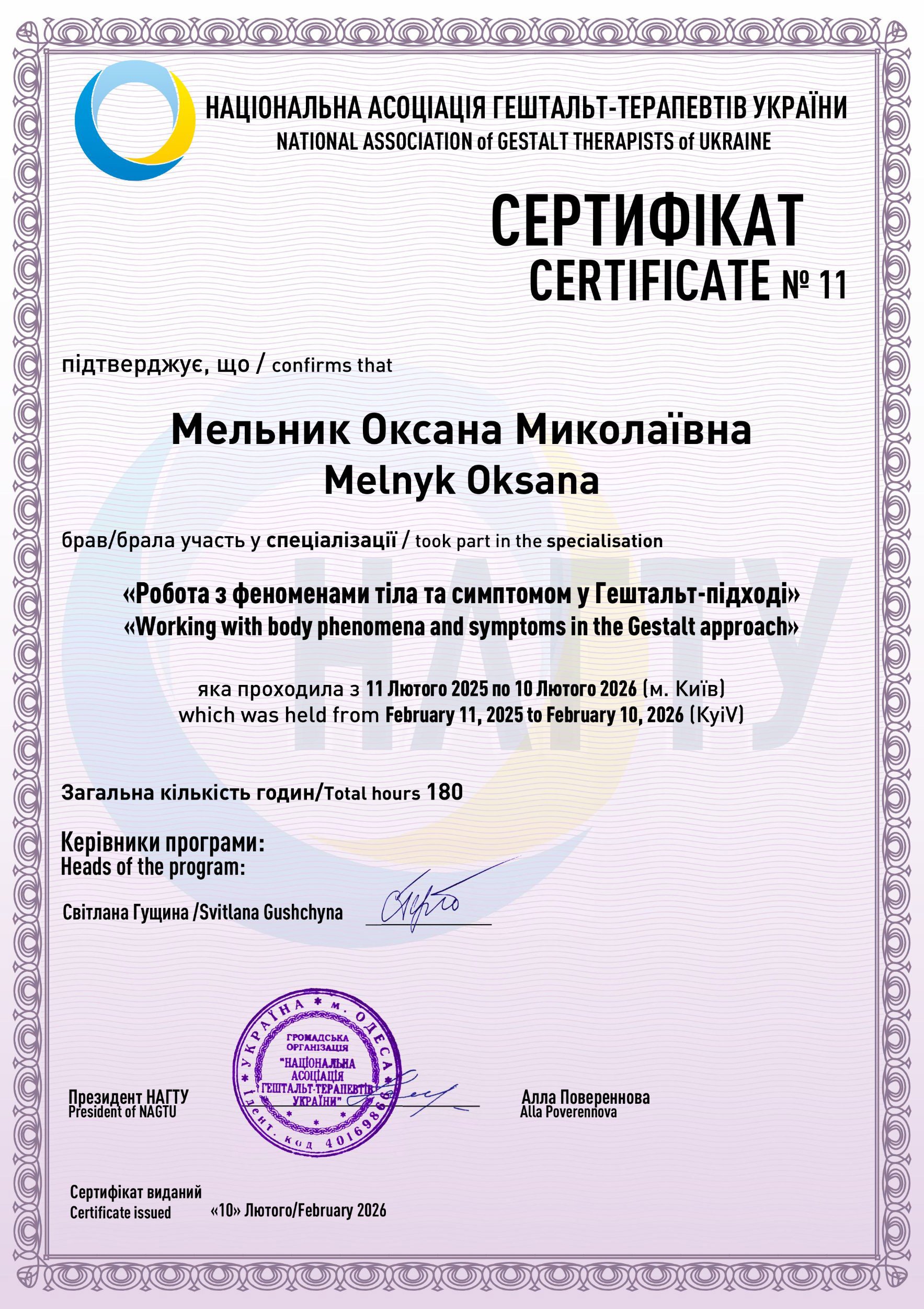 - Спеціалізація: Феномени тіла та симптом в гештальт-підході (спеціалізація у галузі тілесно-орієнтованої терапії та психосоматики), 180 годин (NAGTU, лютий 2026 р)